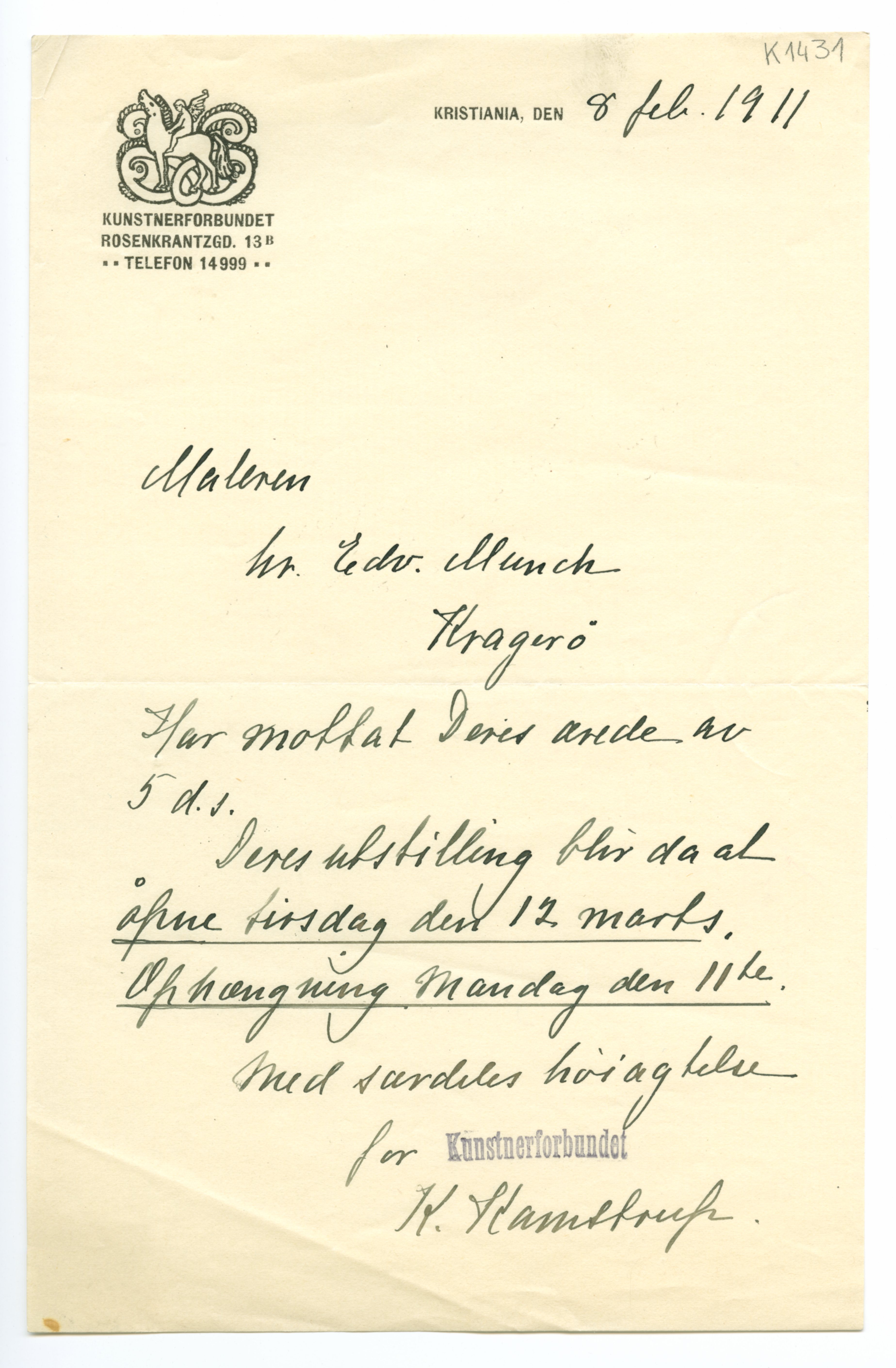 MM K 1431, Munchmuseet. Datert 08.02.1911. Brev fra Kitti Kamstrup, Kunstnerforbundet.