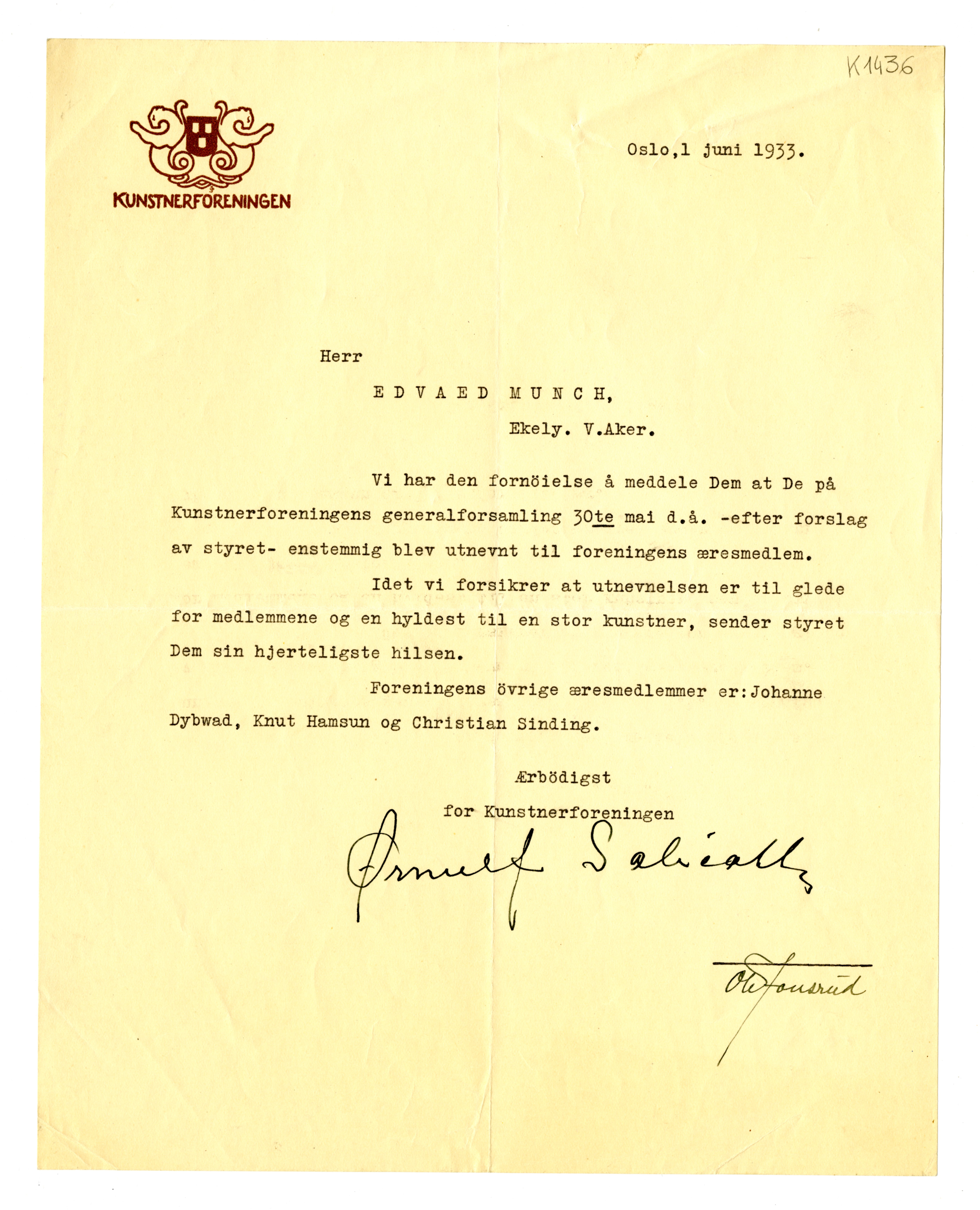 MM K 1436, Munchmuseet. Datert 01.06.1933. Brev fra Kunstnerforbundet, Ørnulf Salicath, Ole Jonsrud.