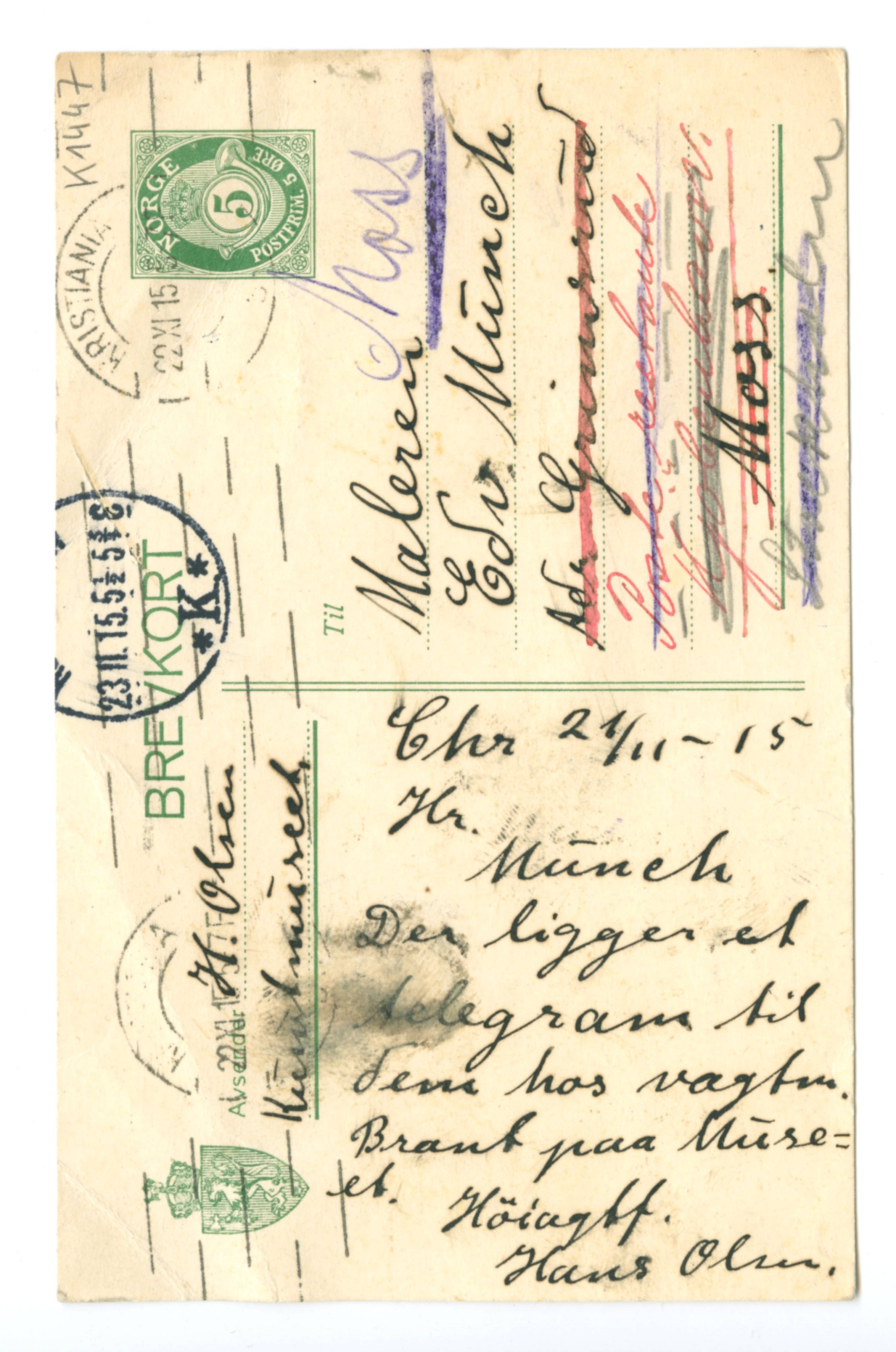 MM K 1447, Munchmuseet. Datert 21.11.1915. Brev fra Hans A. Olsen, Nasjonalgalleriet.