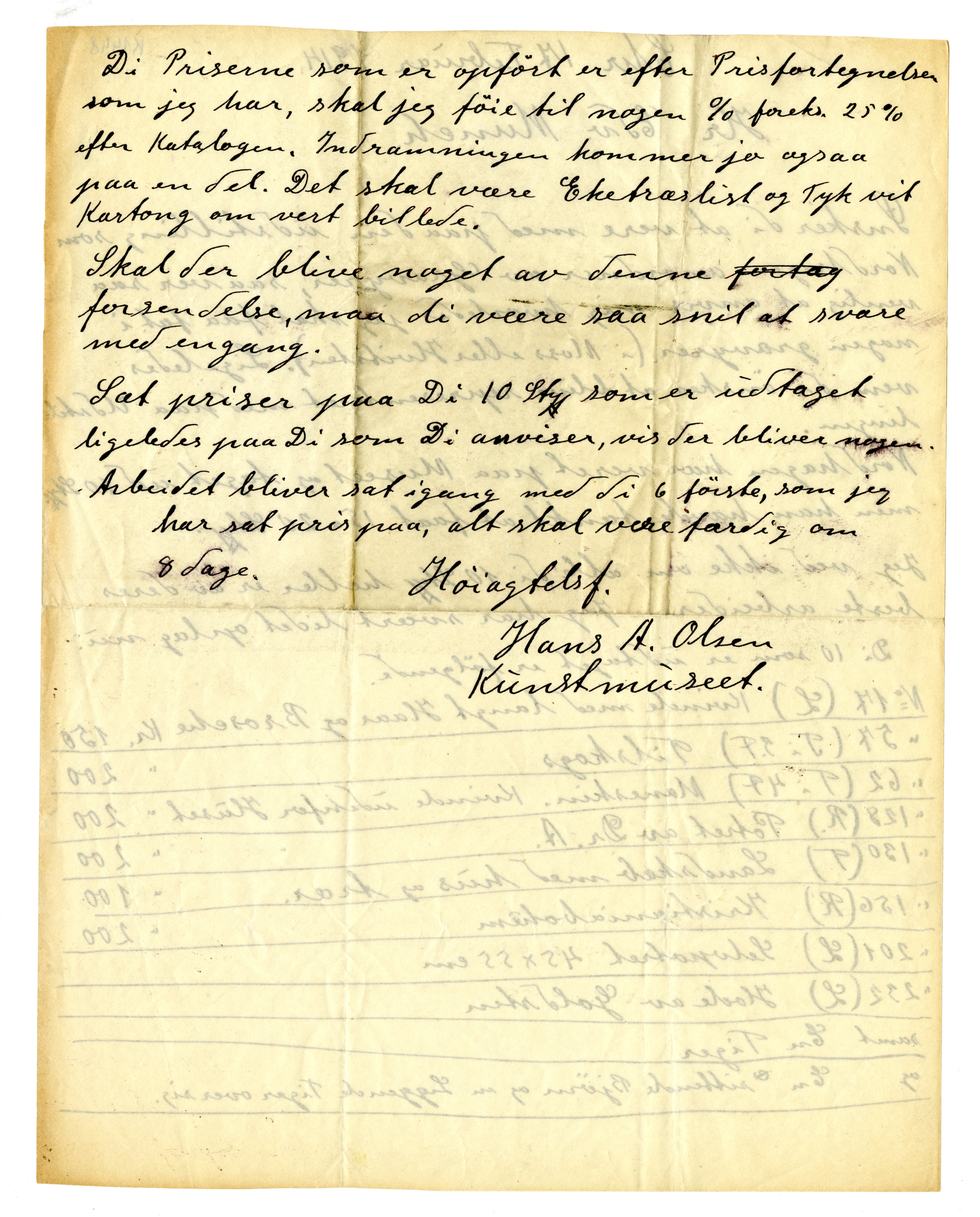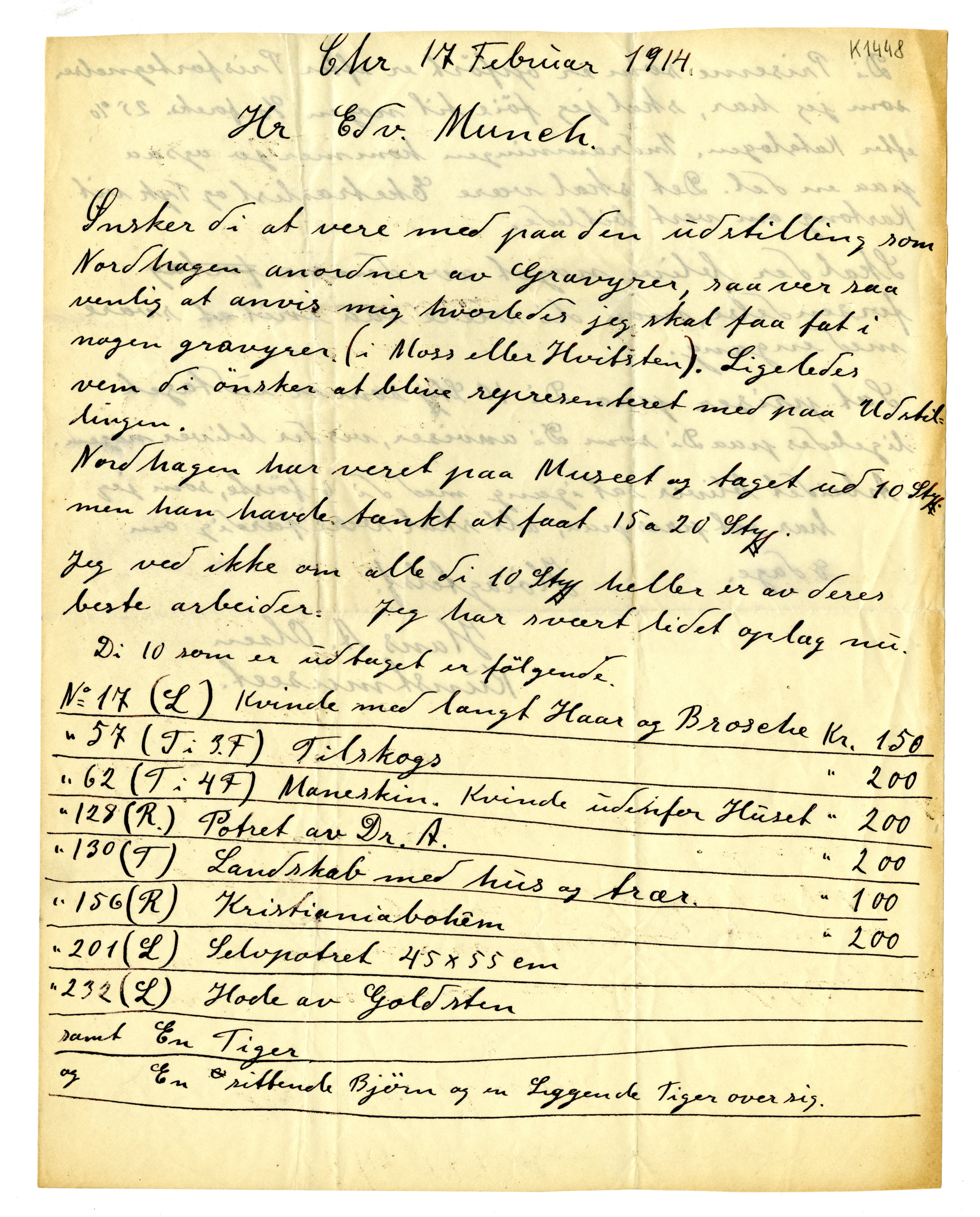 MM K 1448, Munchmuseet. Datert 17.02.1914. Brev fra Hans A. Olsen, Nasjonalgalleriet.