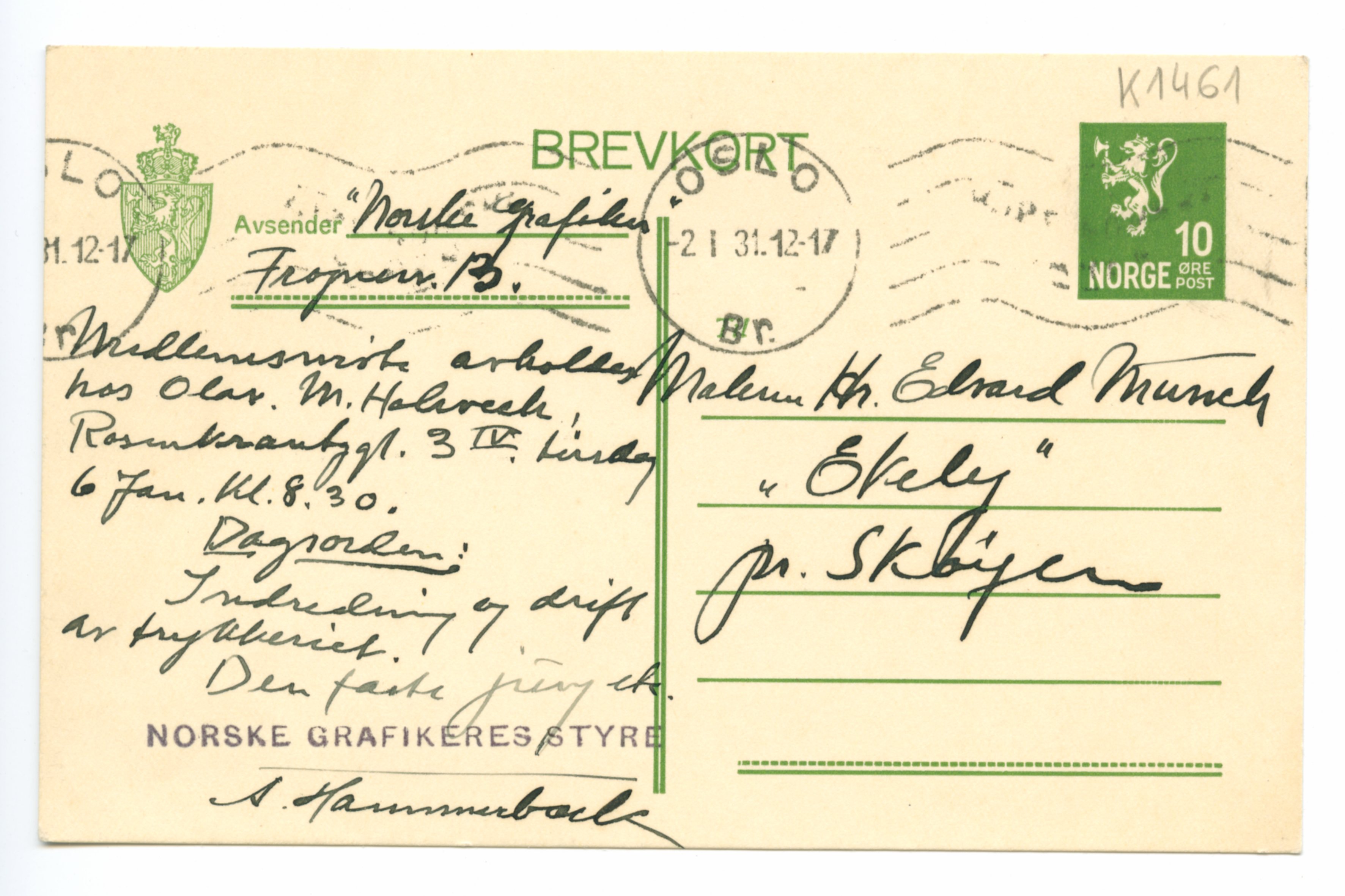 MM K 1461, Munchmuseet. Datert 02.02.1931. Brev fra Norske Grafikere, Alfred Hammarbæck.