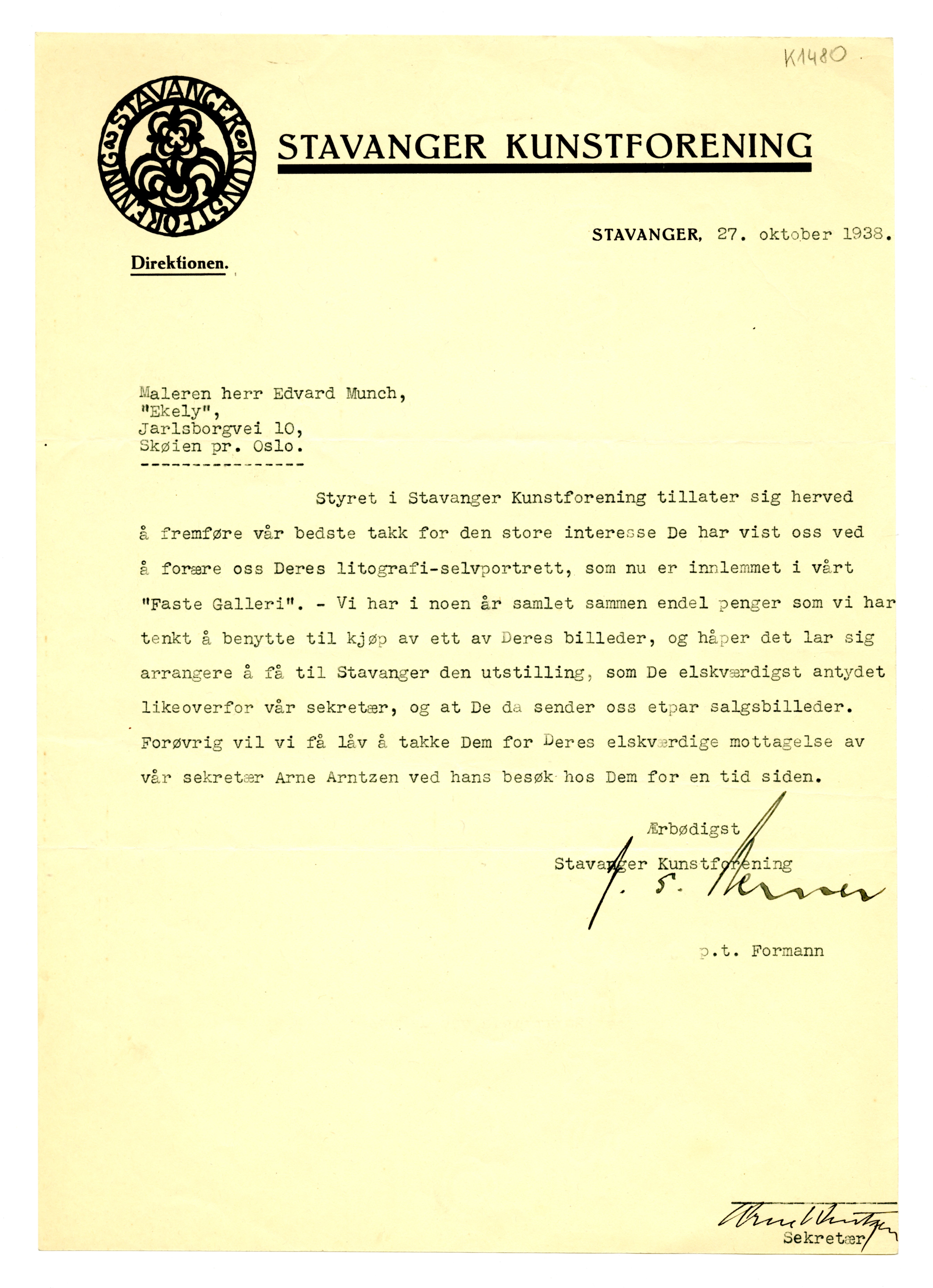 MM K 1480, Munchmuseet. Datert 27.10.1938. Brev fra Stavanger Kunstforening, Joach. S. Berner.