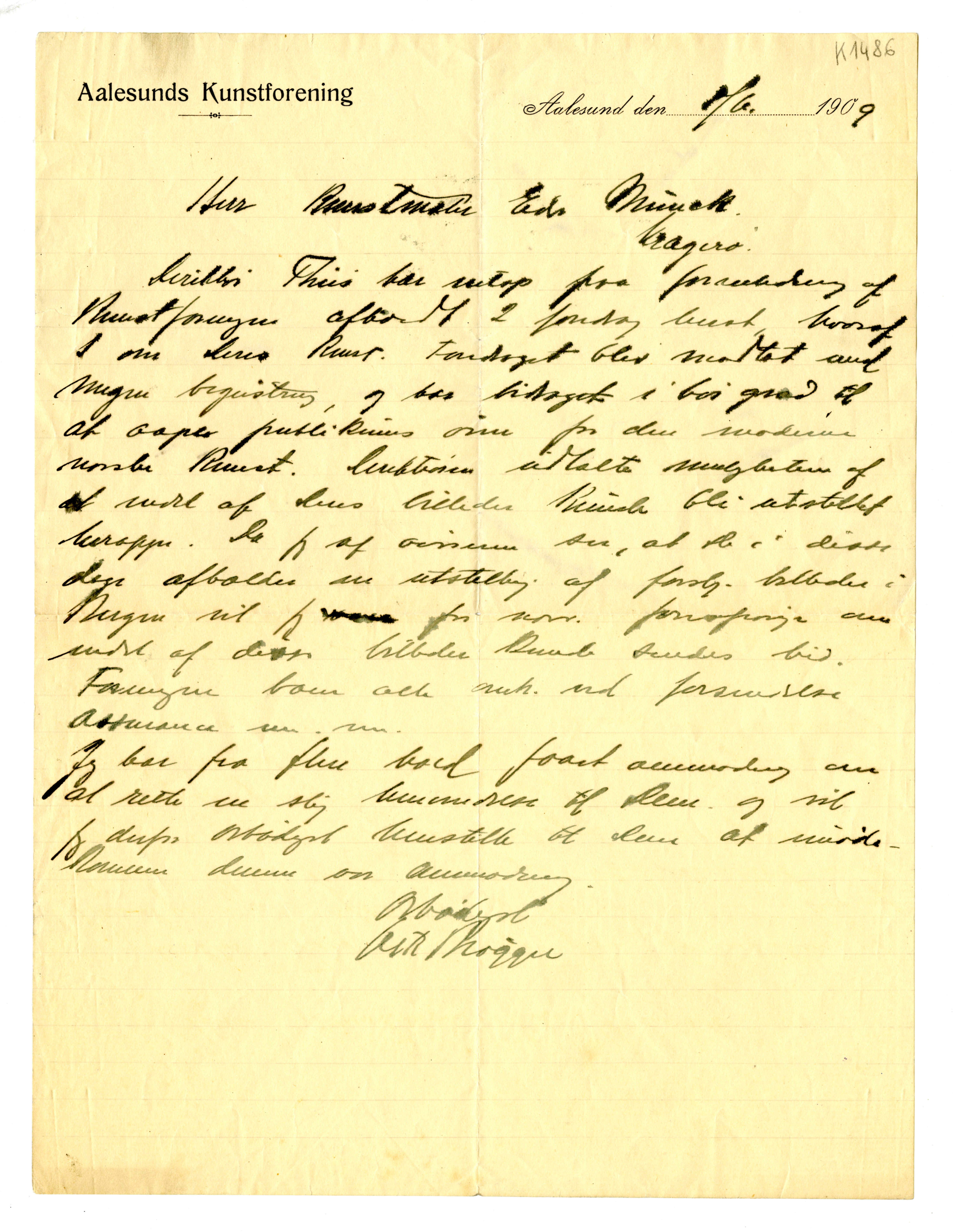 MM K 1486, Munchmuseet. Datert 08.06.1909. Brev fra Aalesund Kunstforening, Kristian Fredrik Brøgger.