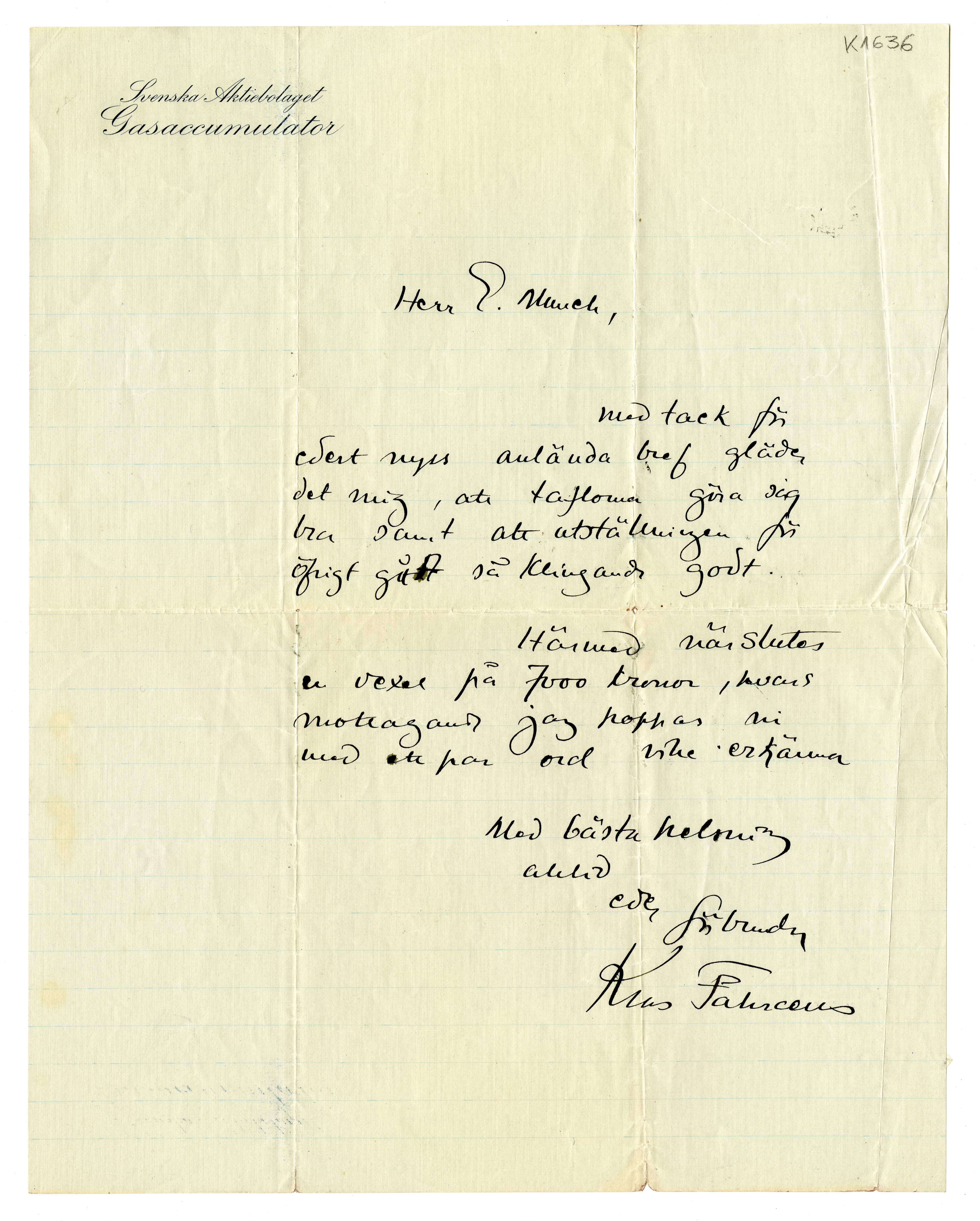 MM K 1636, Munchmuseet. Ikke datert. Brev fra Klas Fåhræus.
