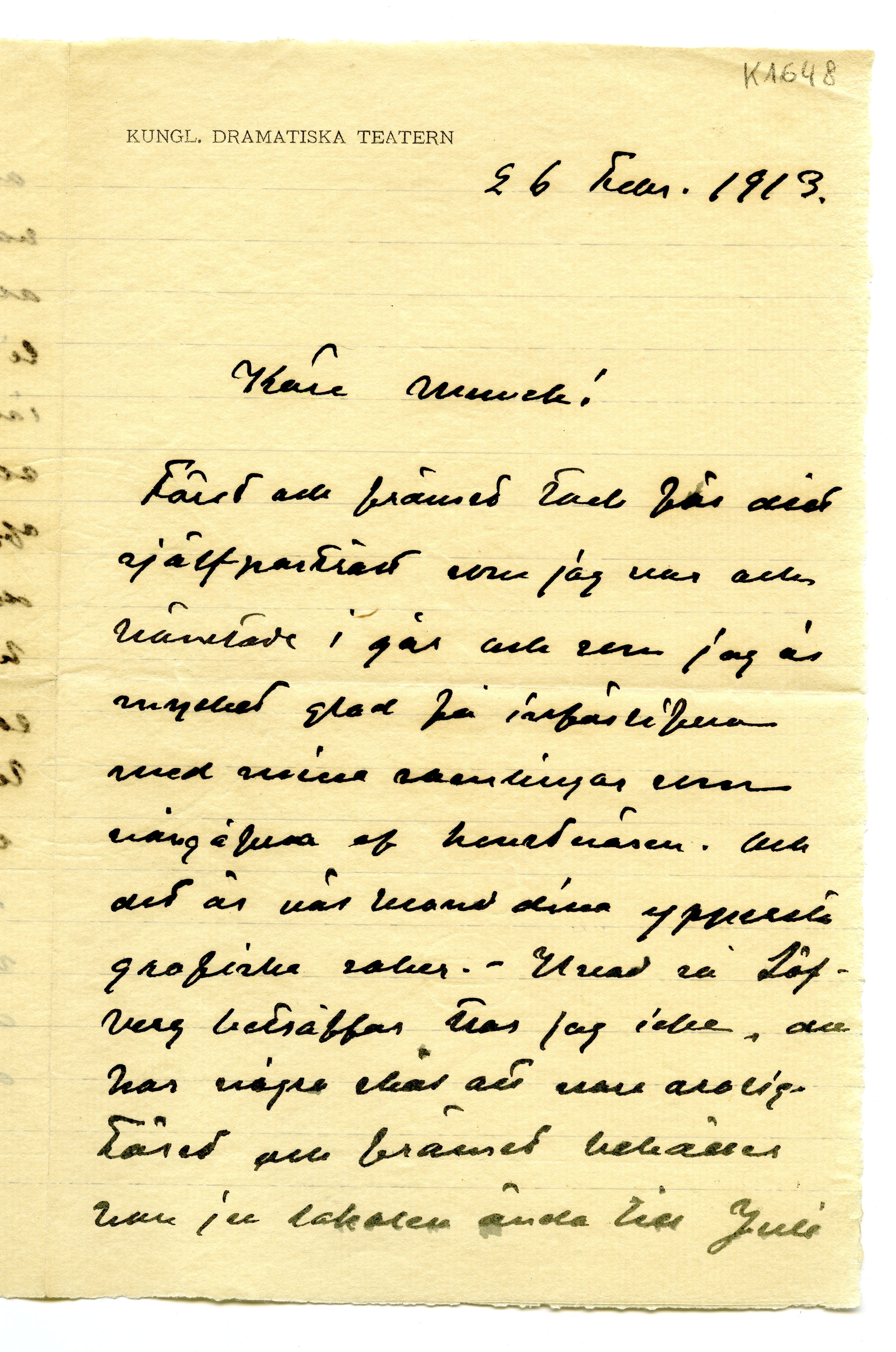 MM K 1648, Munchmuseet. Datert 26.02.1913. Brev fra Tor Hedberg.