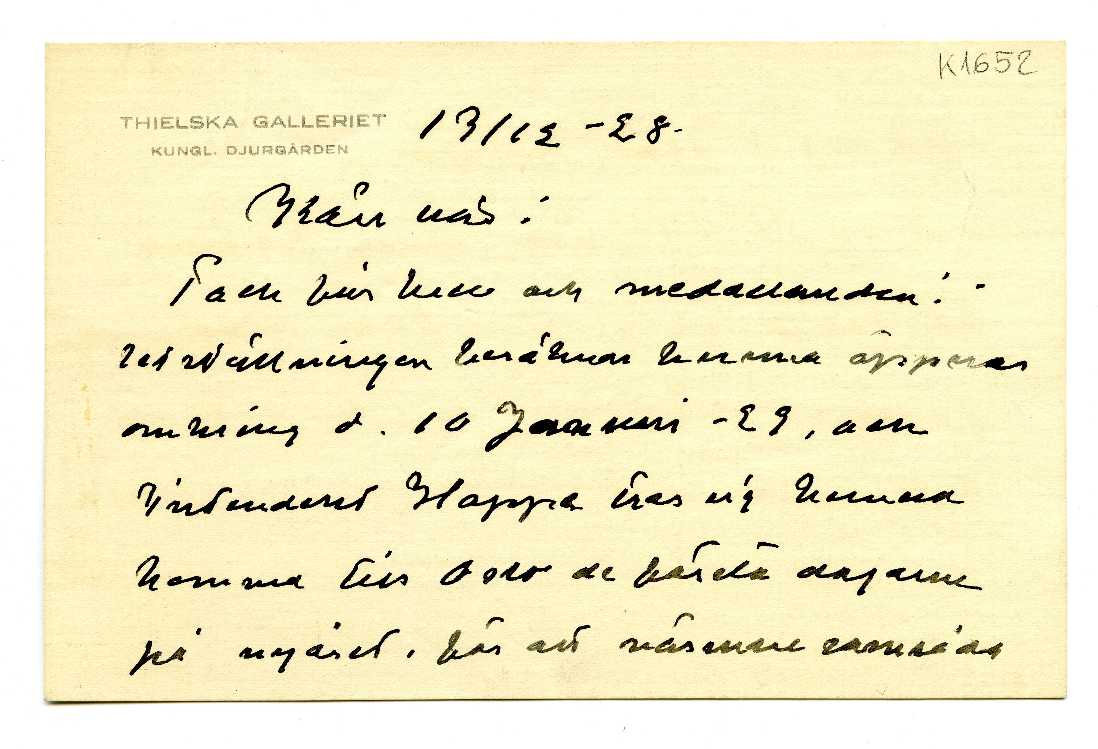 MM K 1652, Munchmuseet. Datert 13.12.1928. Brev fra Tor Hedberg, Thielska Galleriet.