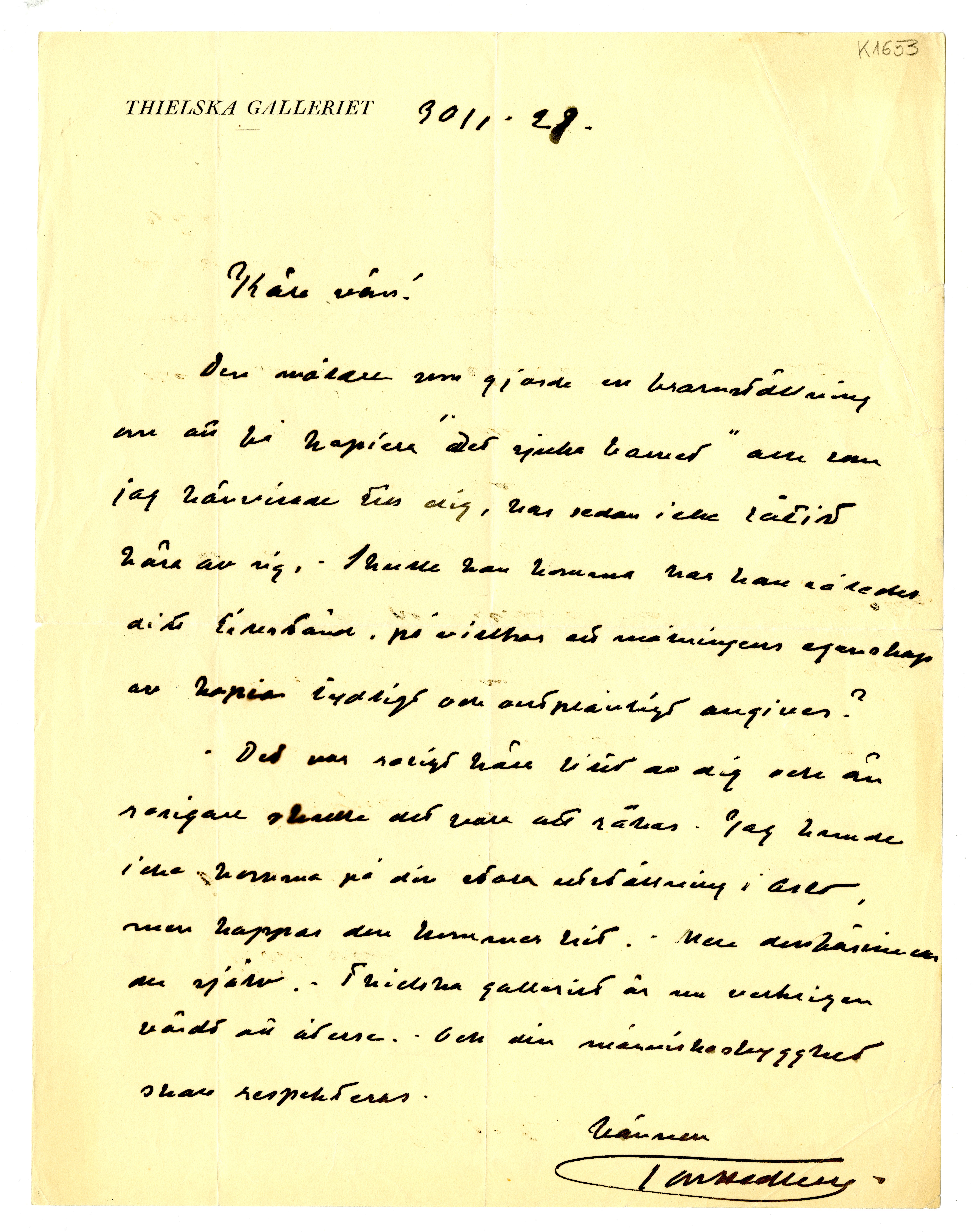 MM K 1653, Munchmuseet. Datert 30.01.1929. Brev fra Tor Hedberg, Thielska Galleriet.