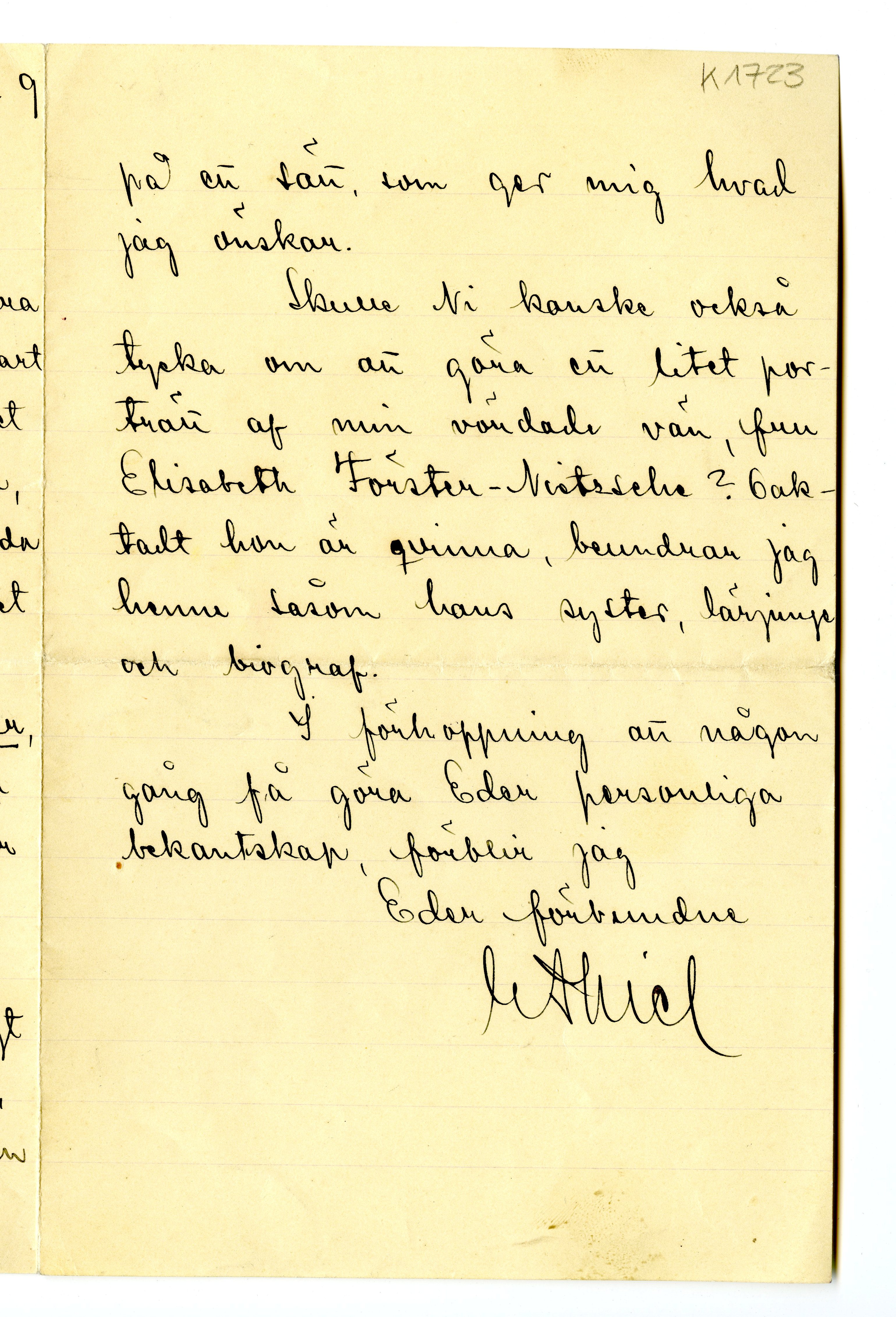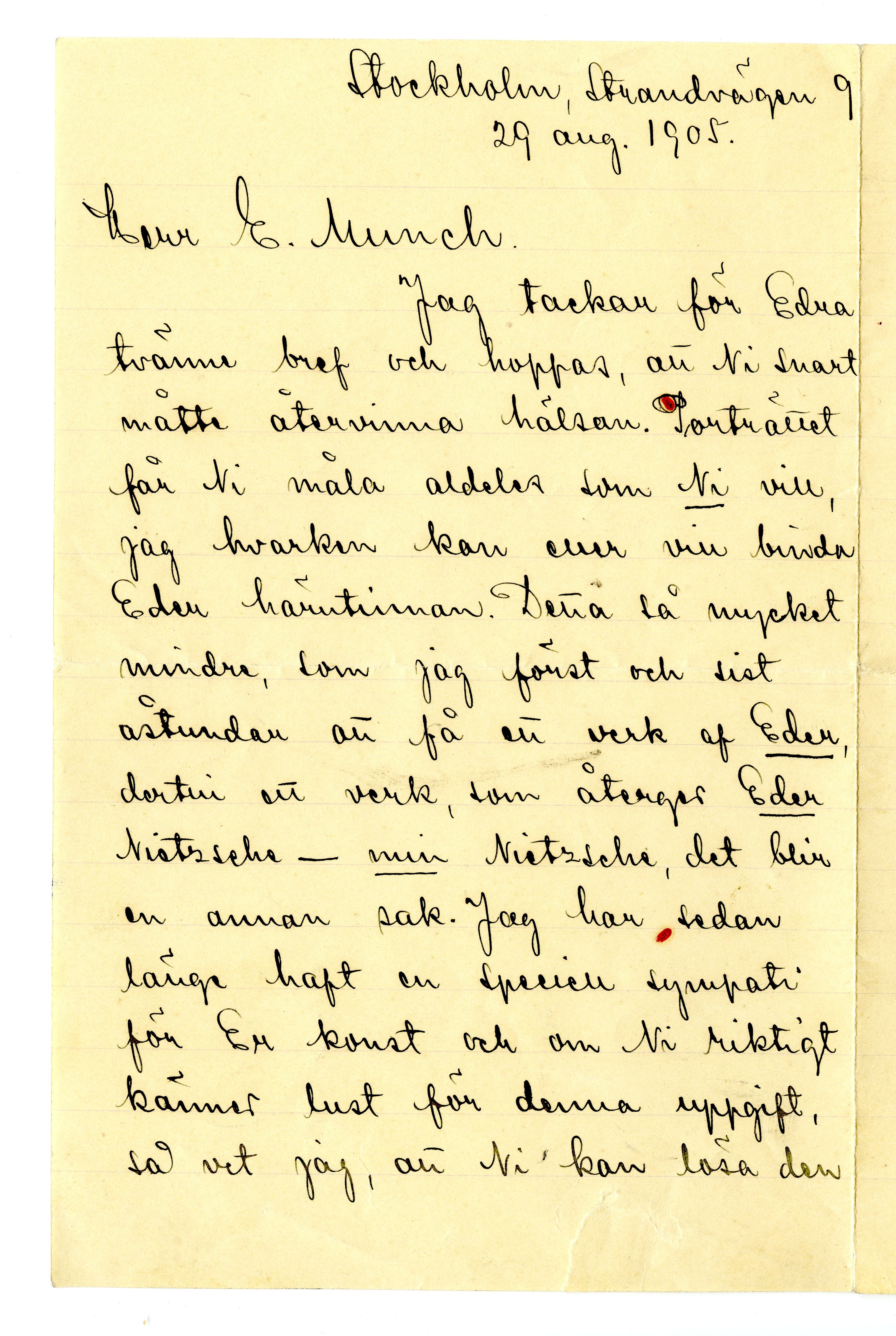 MM K 1723, Munchmuseet. Datert 29.08.1905. Brev fra Ernest Thiel.