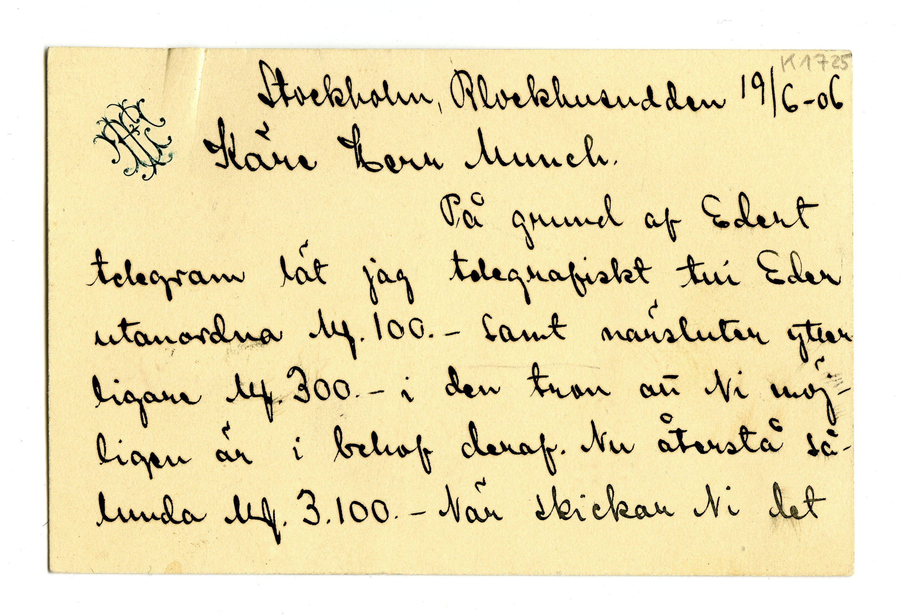 MM K 1725, Munchmuseet. Datert 19.06.1906. Brev fra Ernest Thiel.