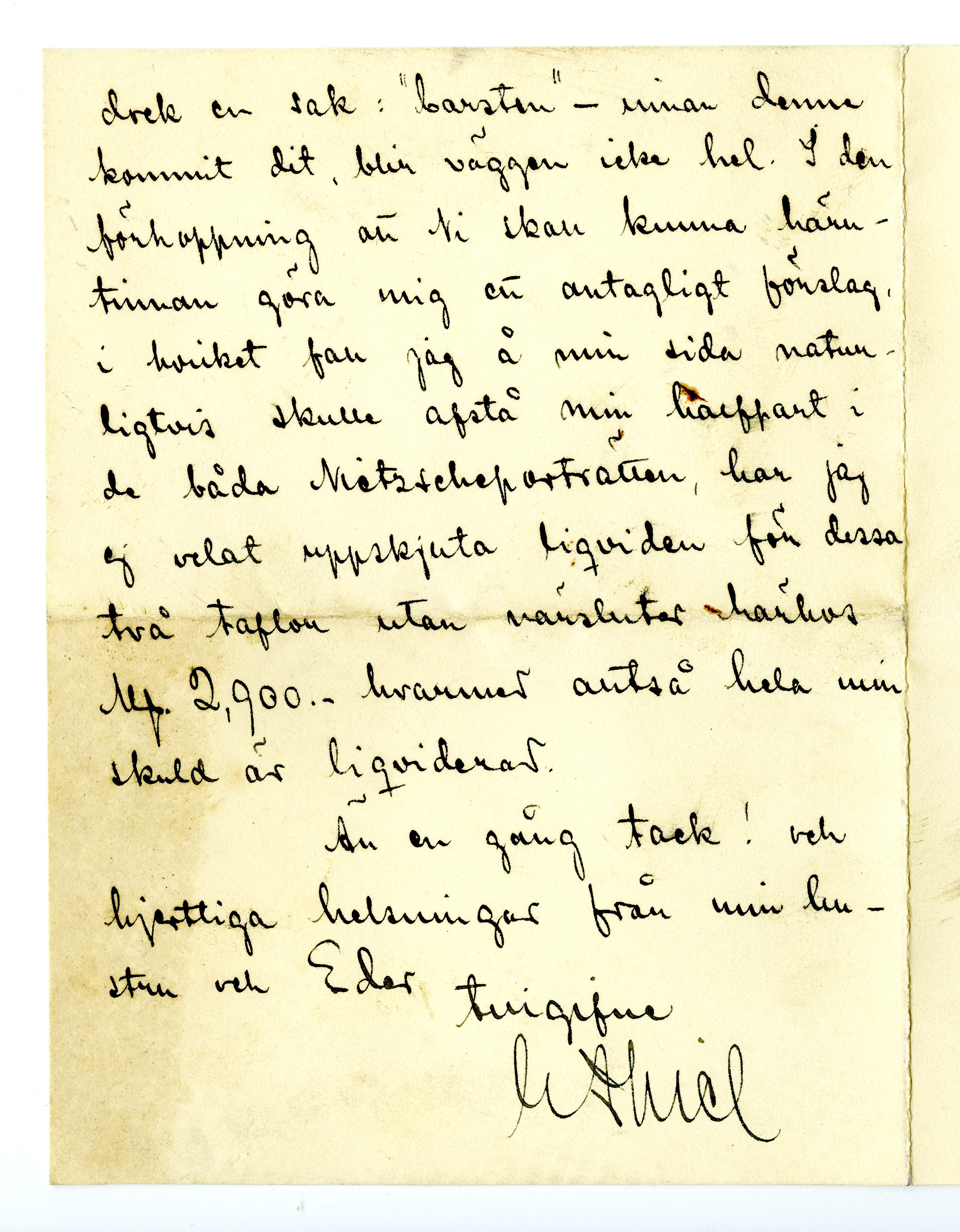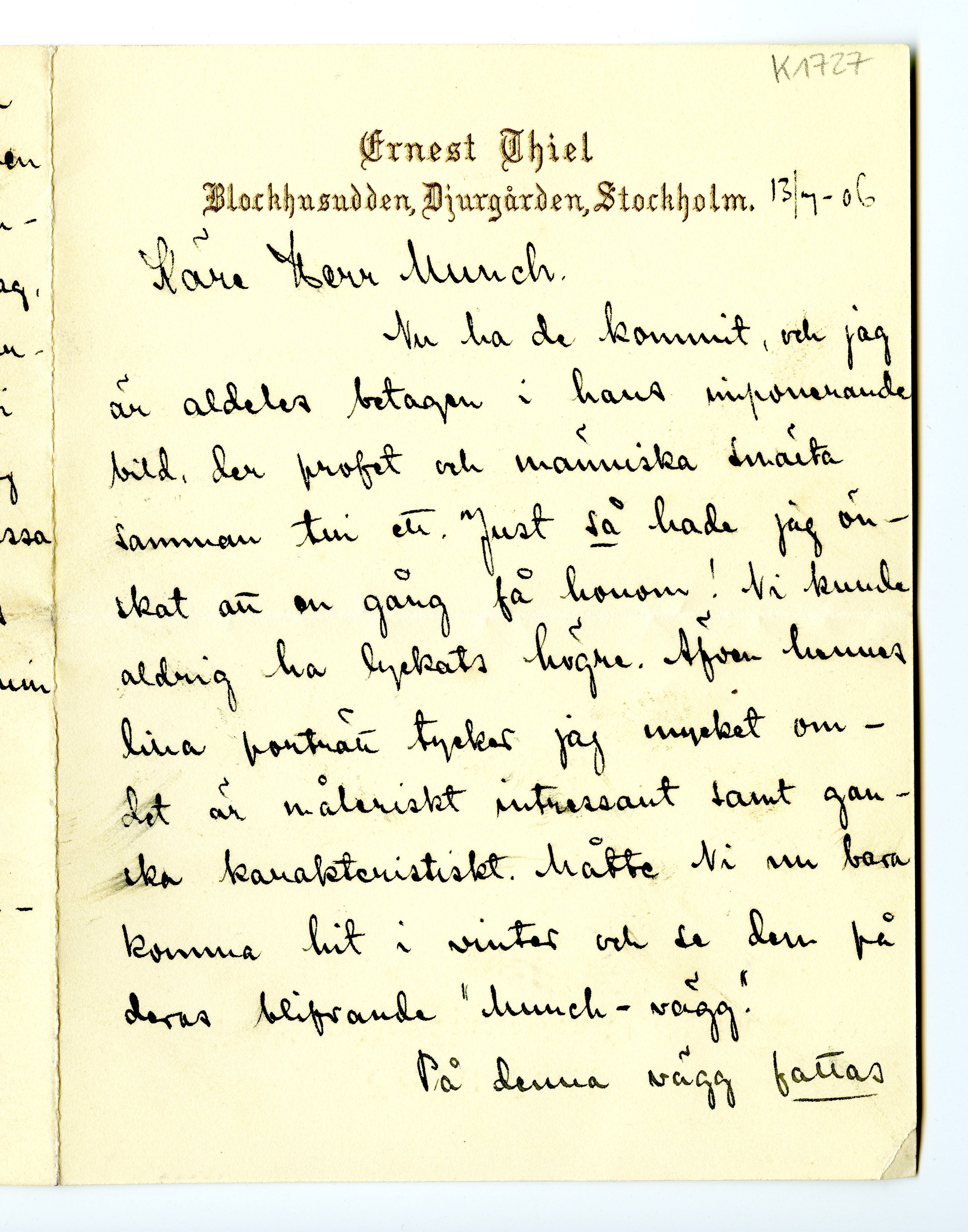 MM K 1727, Munchmuseet. Datert 13.07.1906. Brev fra Ernest Thiel.