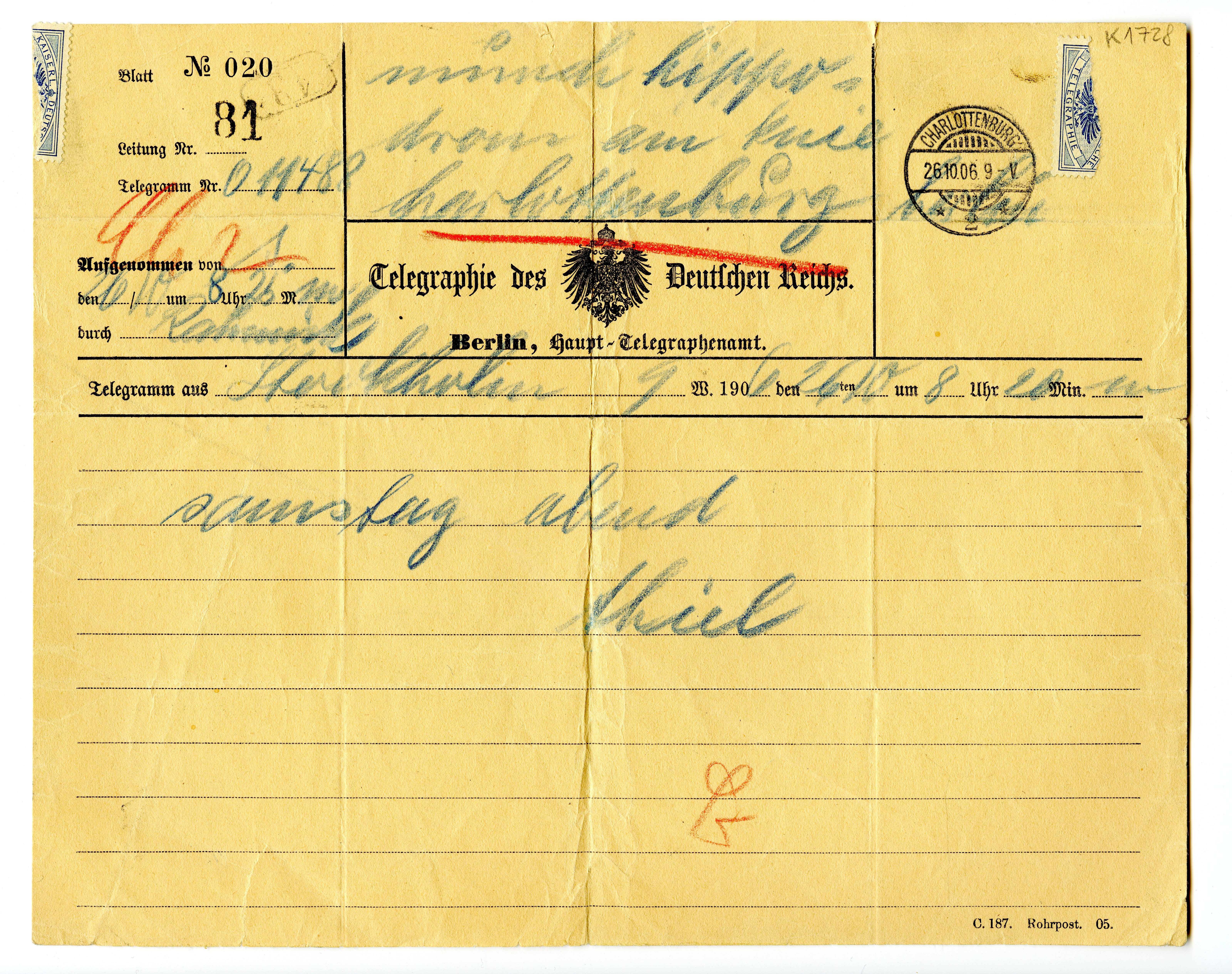 MM K 1728, Munchmuseet. Datert 26.10.1906. Brev fra Ernest Thiel.