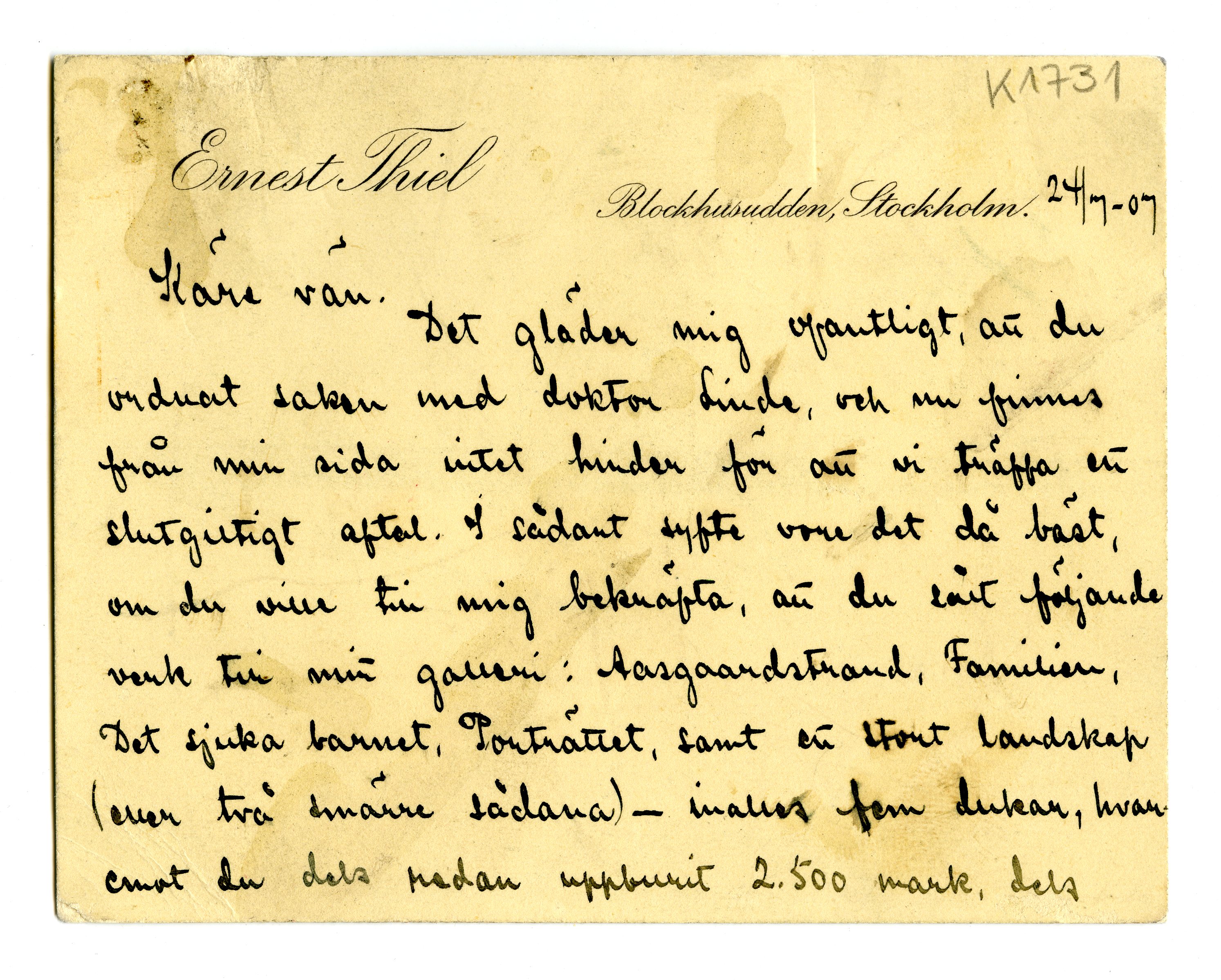 MM K 1731, Munchmuseet. Datert 24.07.1907. Brev fra Ernest Thiel.