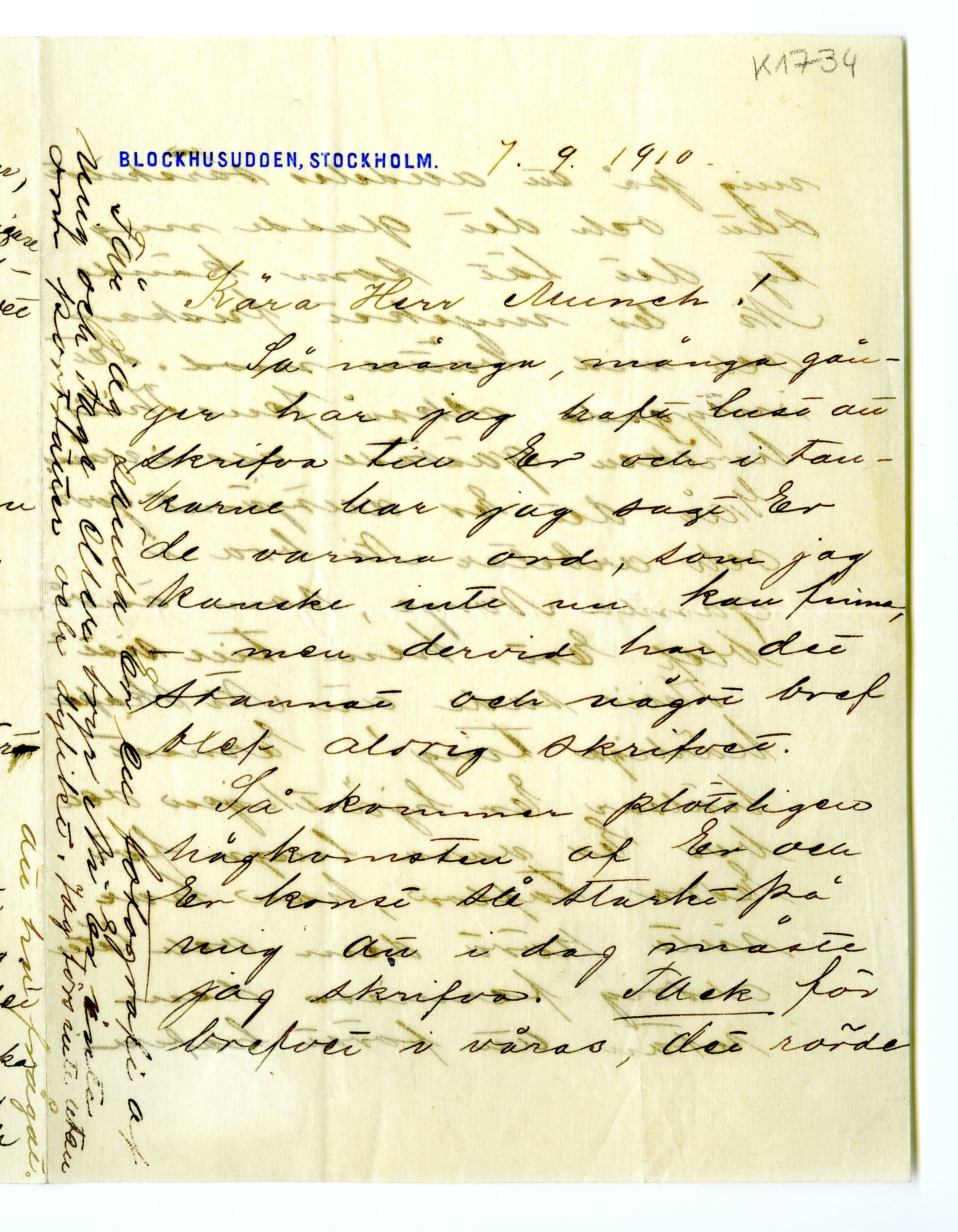 MM K 1734, Munchmuseet. Datert 07.09.1910. Brev fra Signe Thiel.
