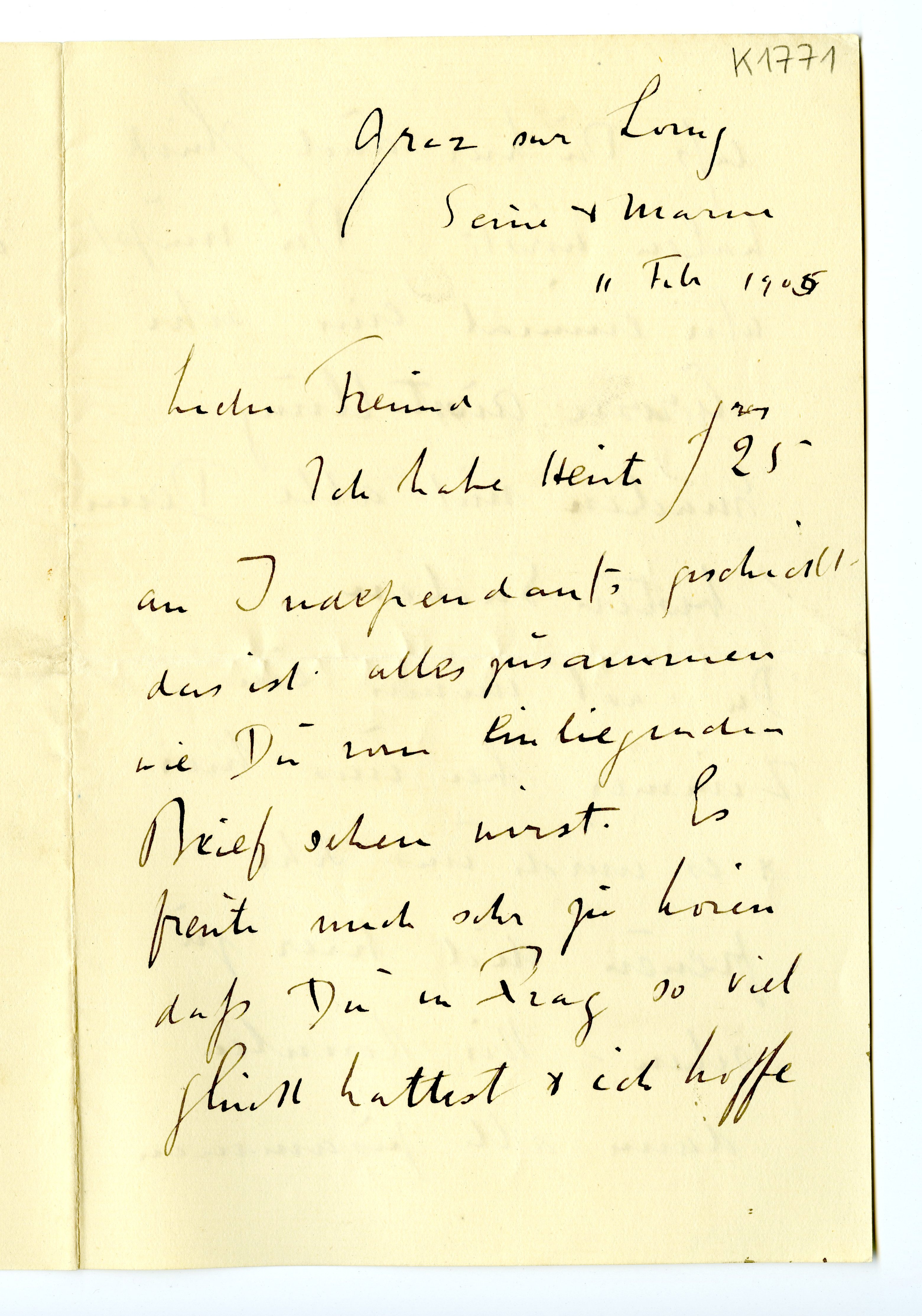 MM K 1771, Munchmuseet. Datert 11.02.1905. Brev fra Frederick Delius.