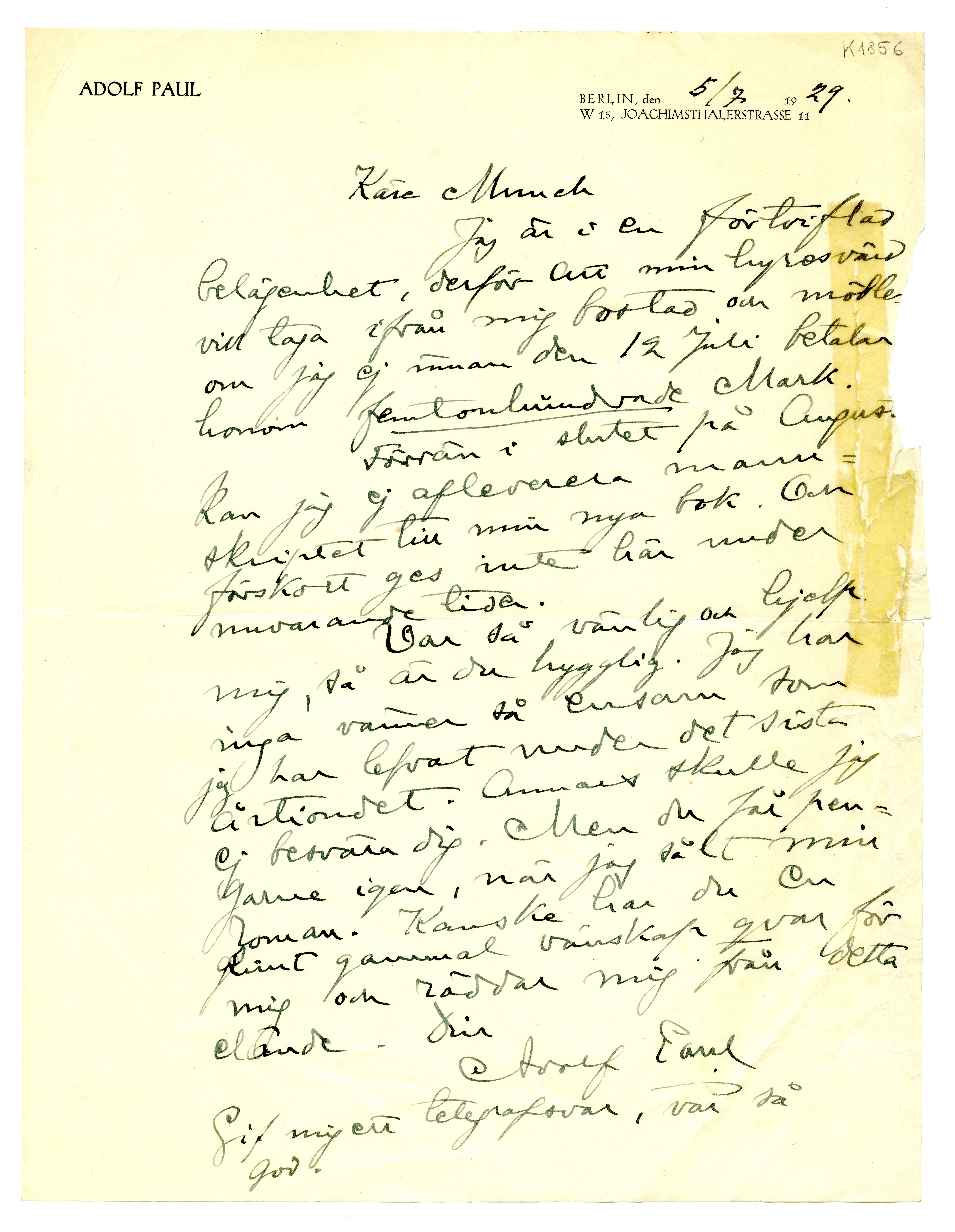 MM K 1856, Munchmuseet. Datert 05.07.1929. Brev fra Adolf Paul.
