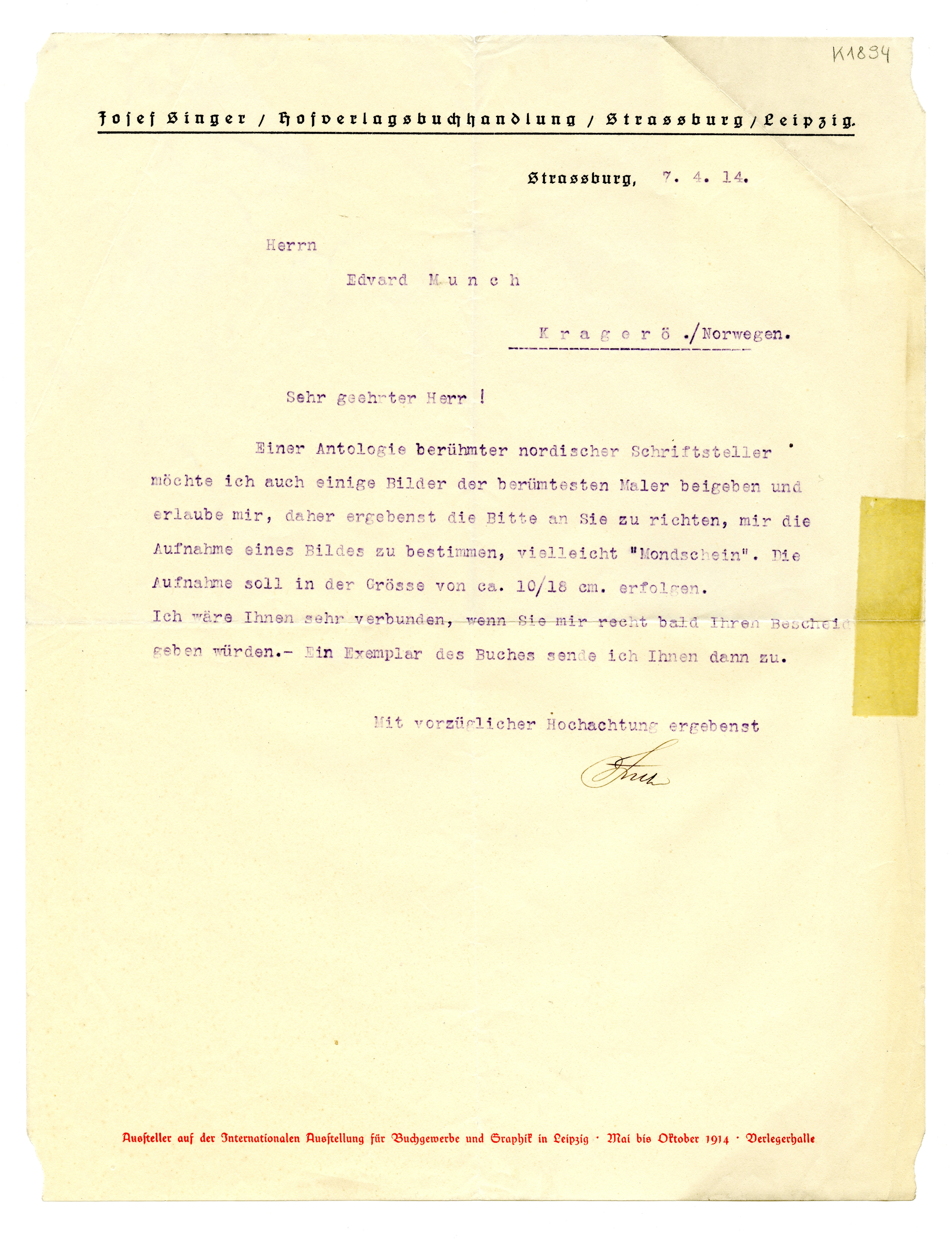 MM K 1894, Munchmuseet. Datert 07.04.1914. Brev fra Josef Singer, Josef Singer Hofverlagsbuchhandlung.