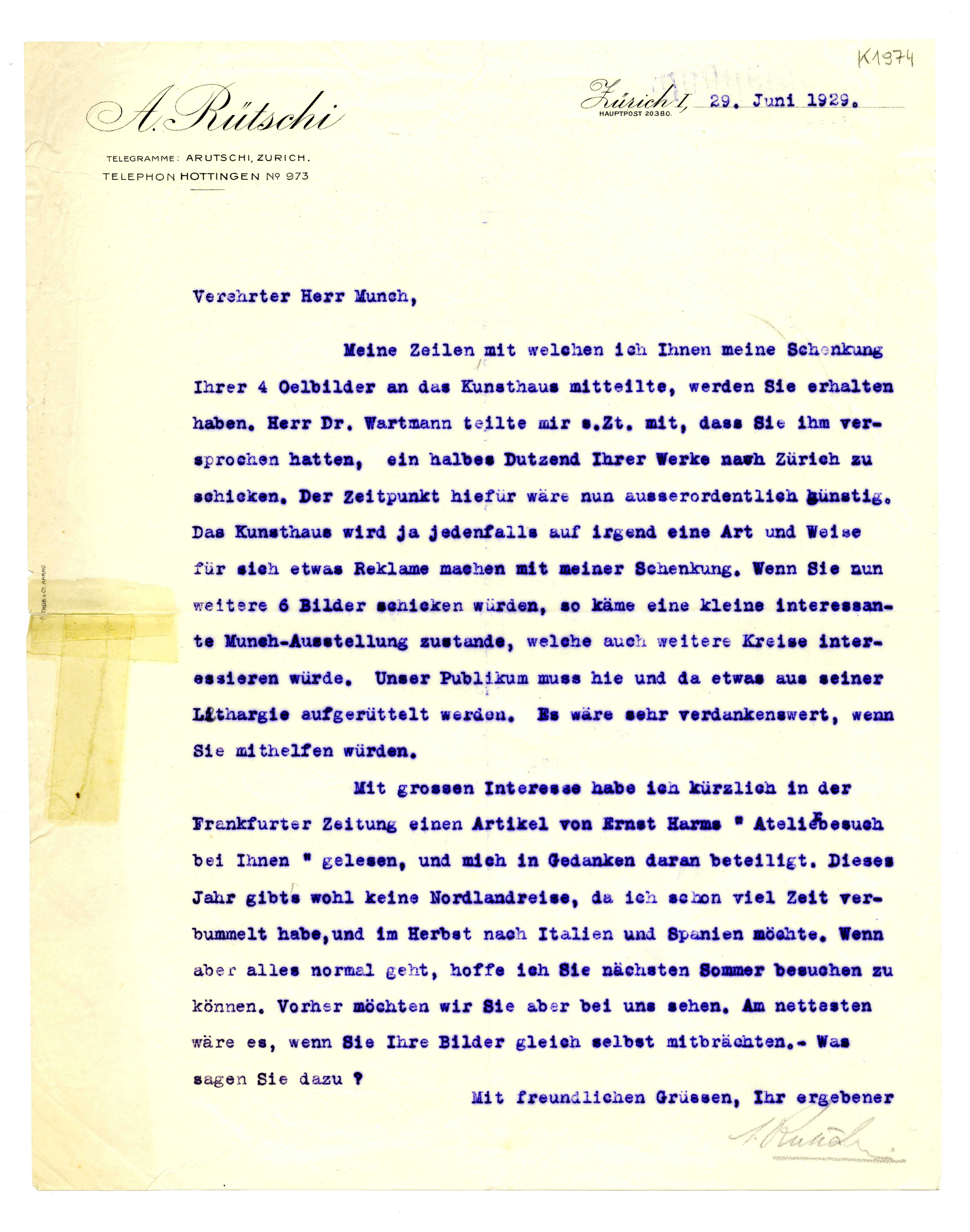 MM K 1974, Munchmuseet. Datert 29.06.1929. Brev fra Alfred Rütschi.