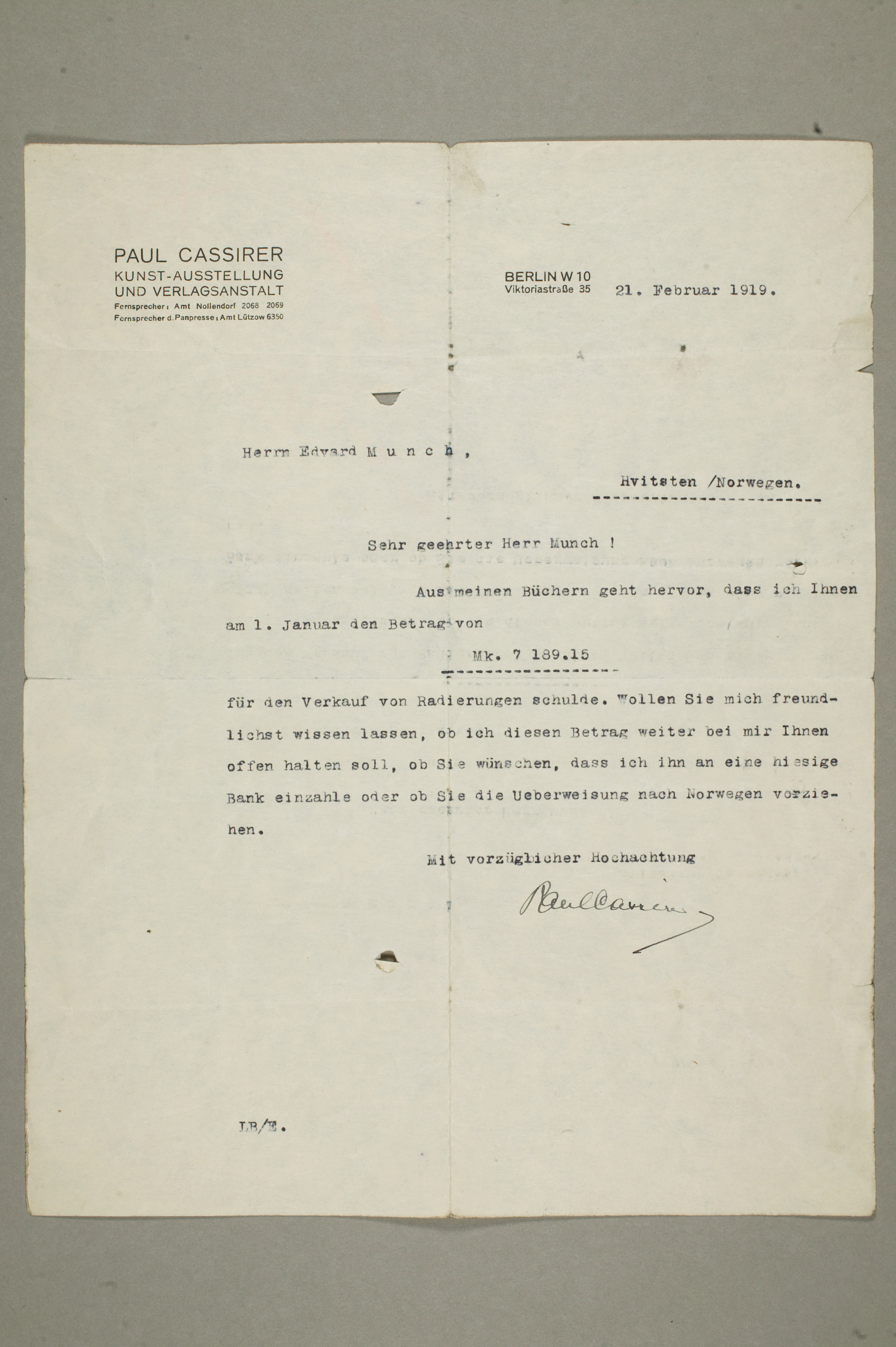 MM K 2089, Munchmuseet. Datert 21.02.1919. Brev fra Paul Cassirer, Kunstsalon Paul Cassirer.