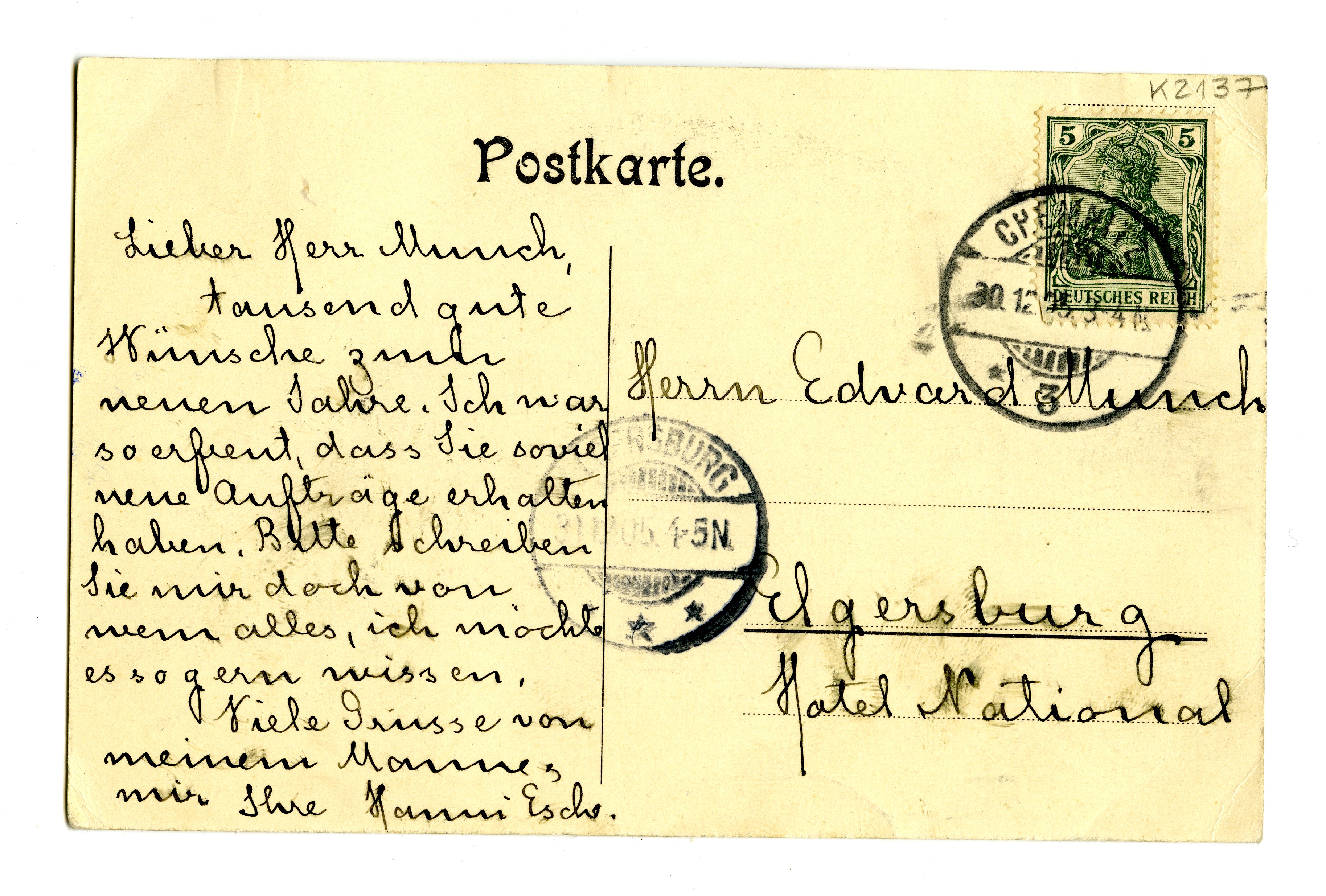 MM K 2137, Munchmuseet. Datert 30.12.1905. Brev fra Hanni Esche.