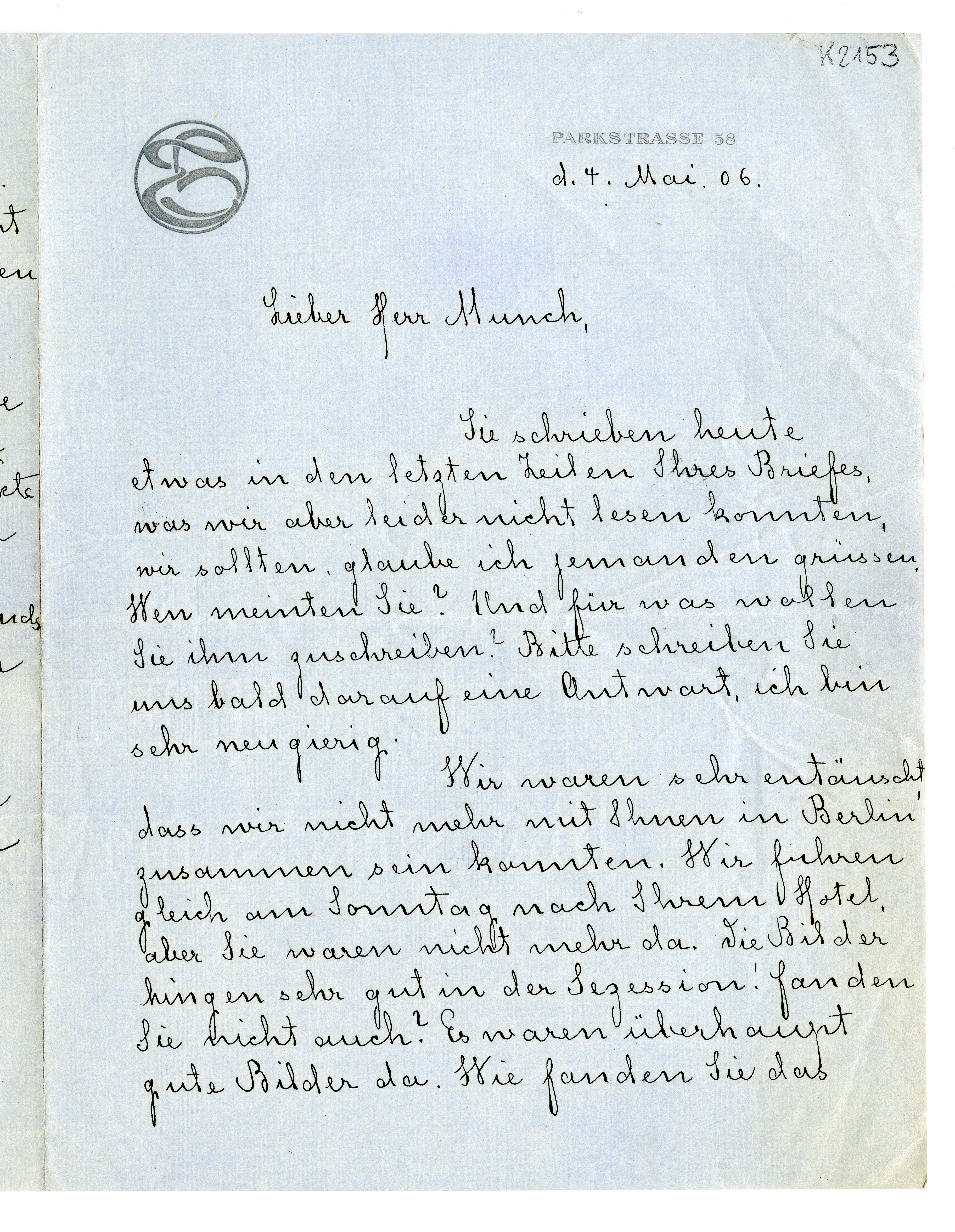 MM K 2153, Munchmuseet. Datert 04.05.1906. Brev fra Hanni Esche.
