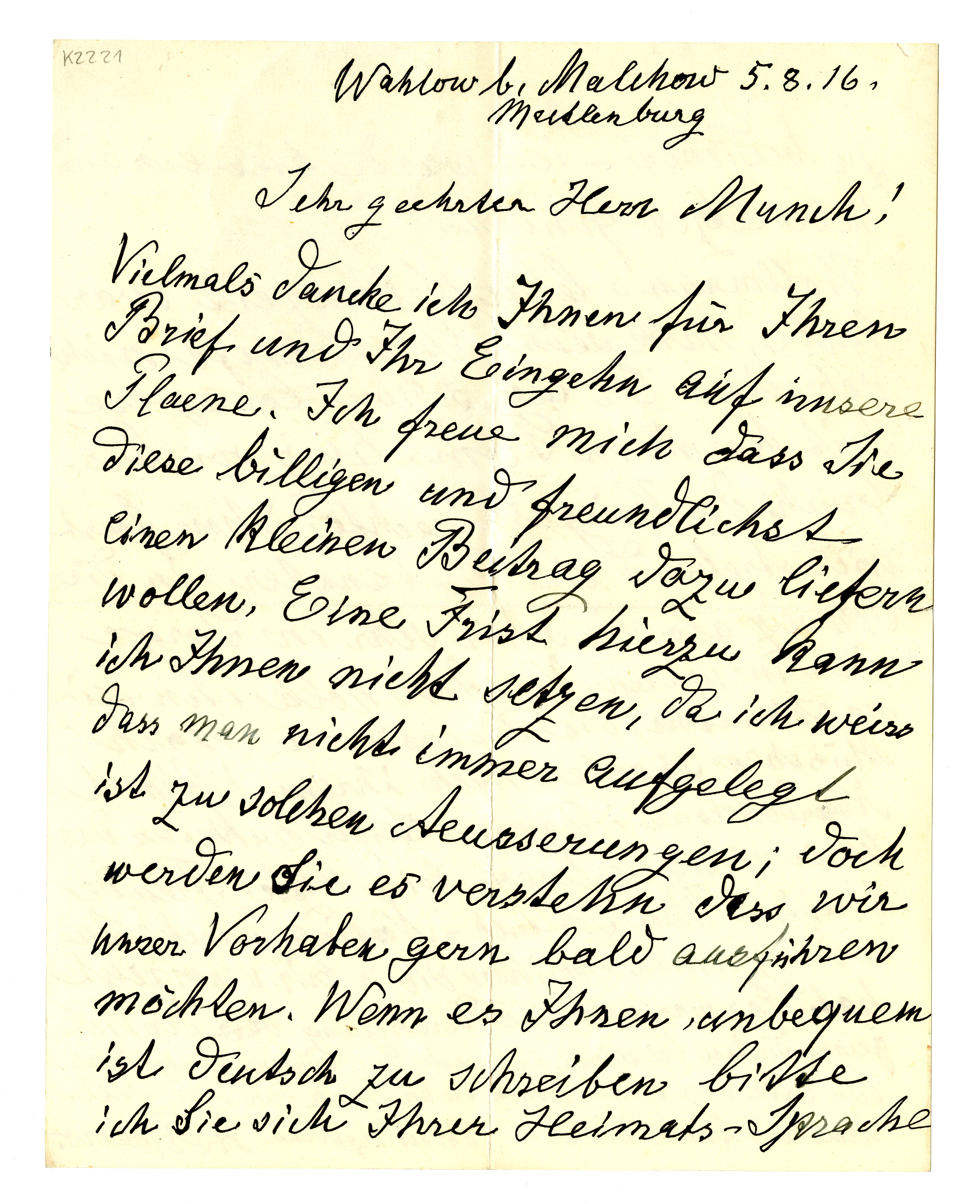 MM K 2221, Munchmuseet. Datert 05.08.1916. Brev fra H. von Flotow.