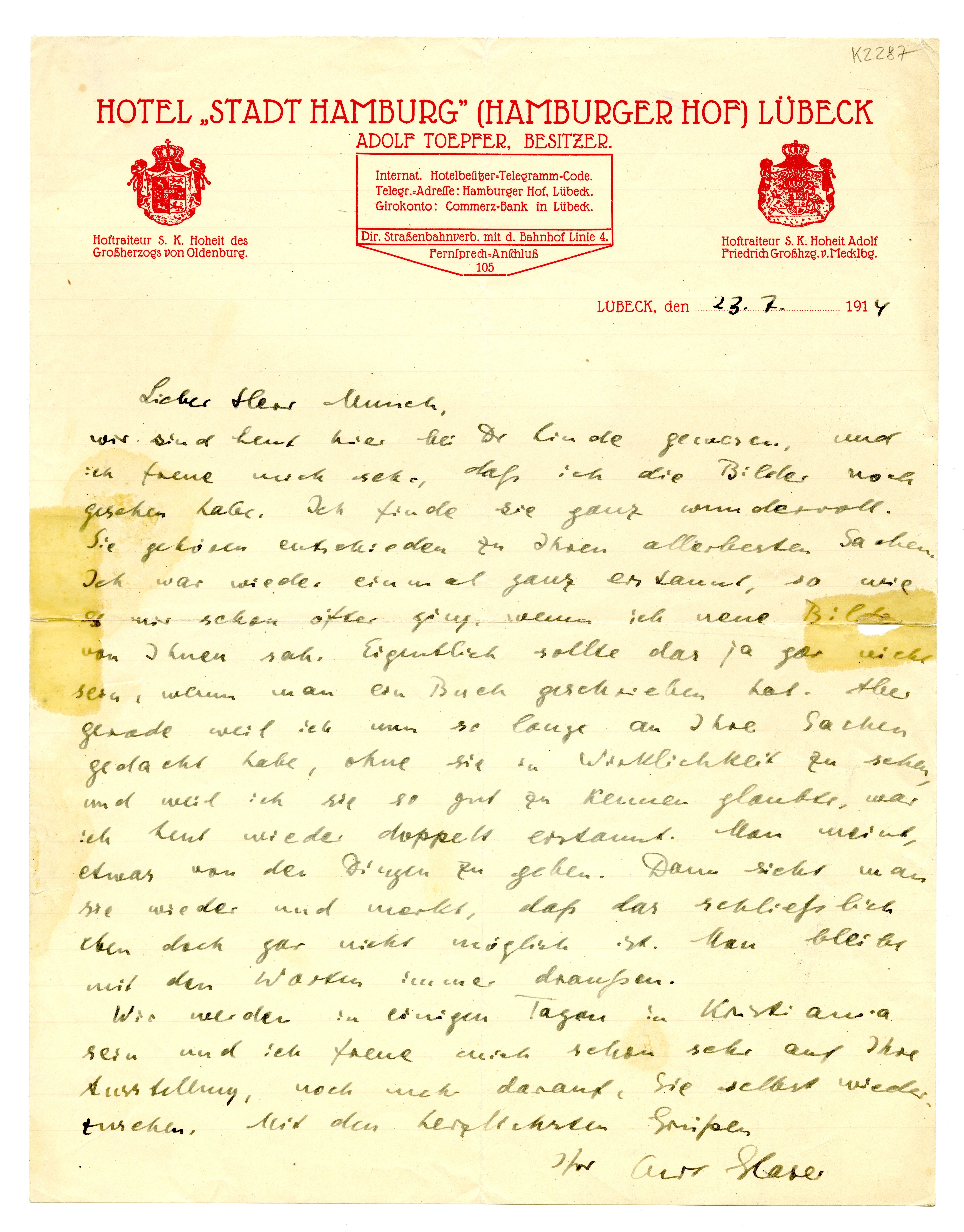 MM K 2287, Munchmuseet. Datert 23.07.1914. Brev fra Curt Glaser.