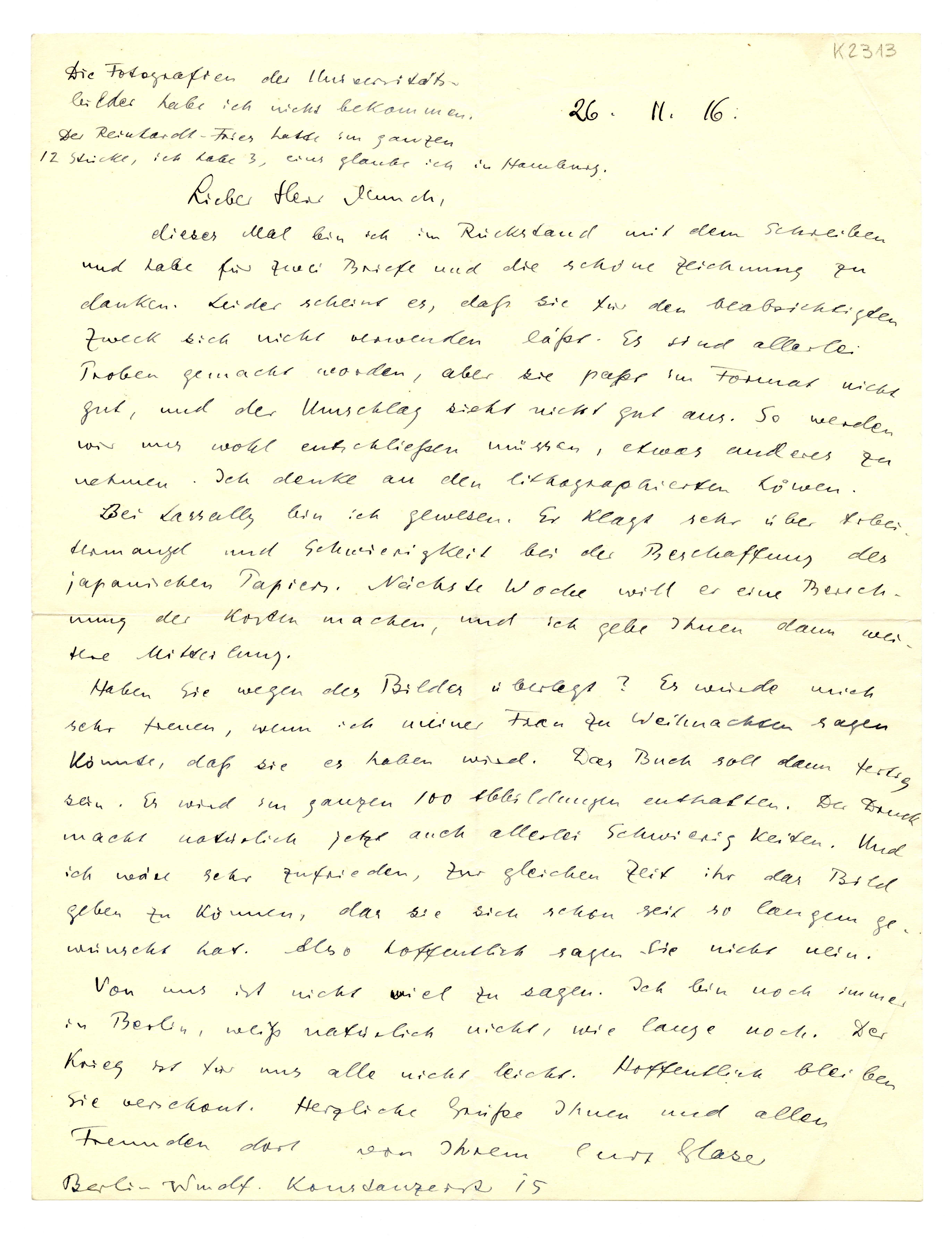MM K 2313, Munchmuseet. Datert 26.11.1916. Brev fra Curt Glaser.