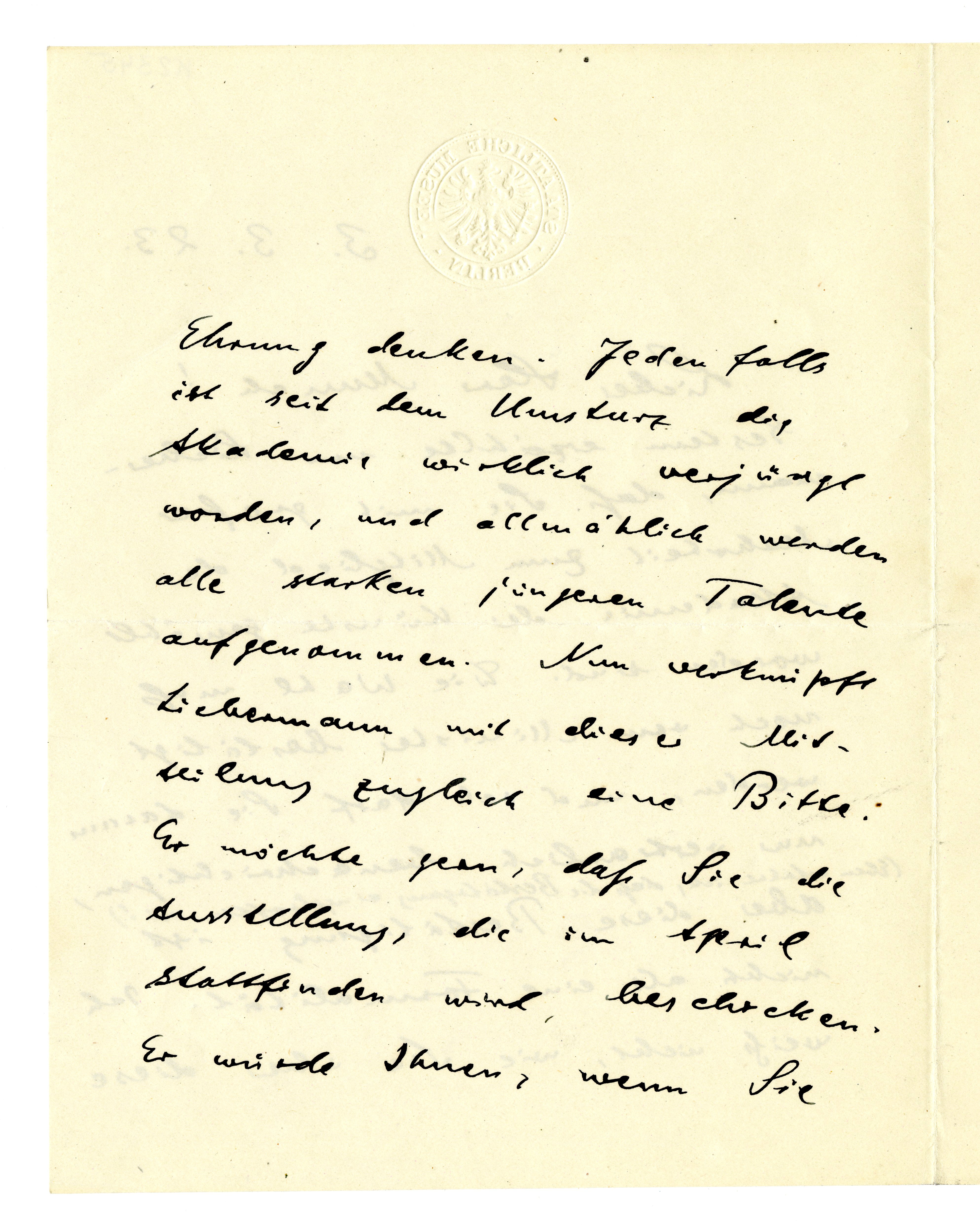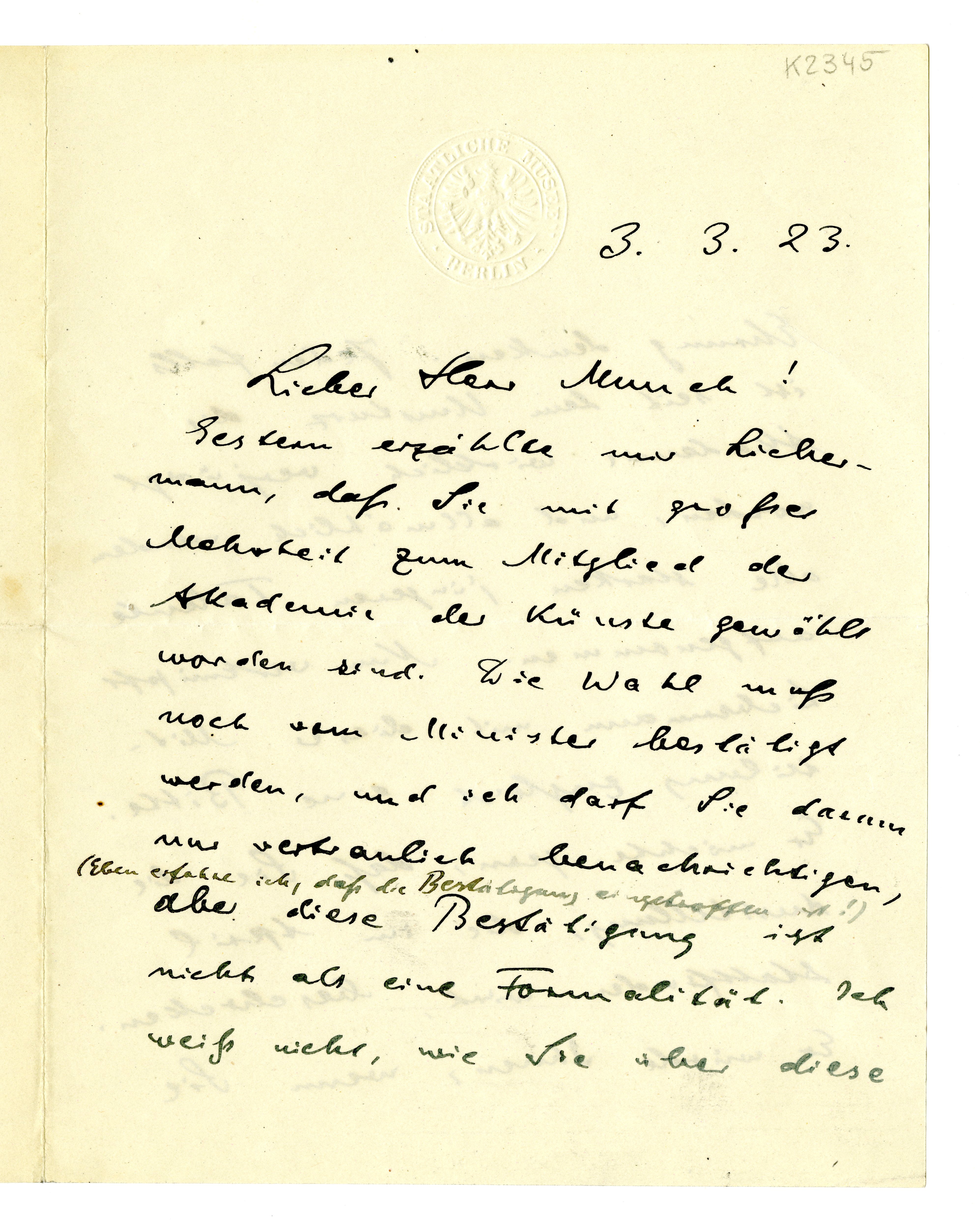 MM K 2345, Munchmuseet. Datert 03.03.1923. Brev fra Curt Glaser, Staatliche Museen.