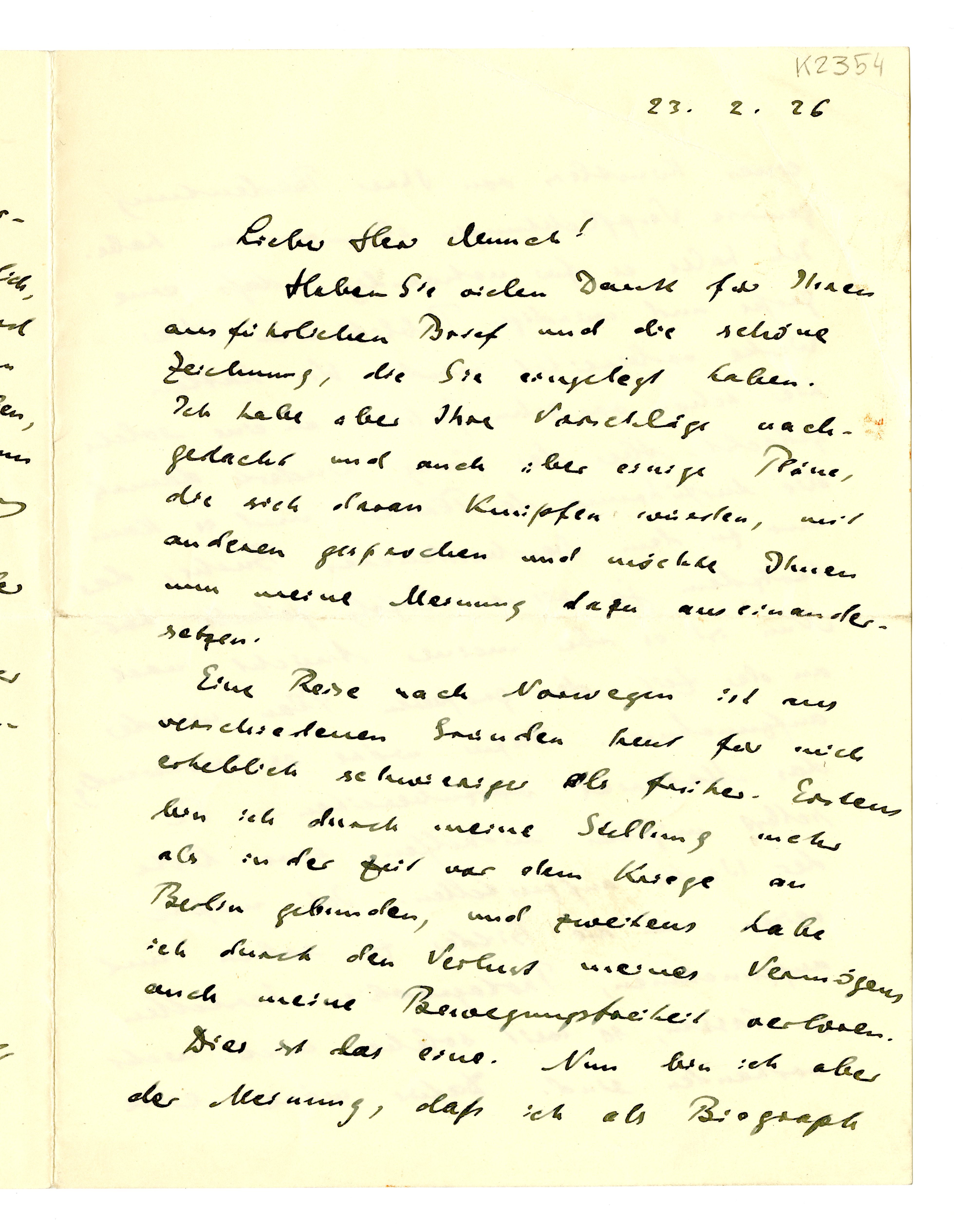 MM K 2354, Munchmuseet. Datert 23.02.1926. Brev fra Curt Glaser.