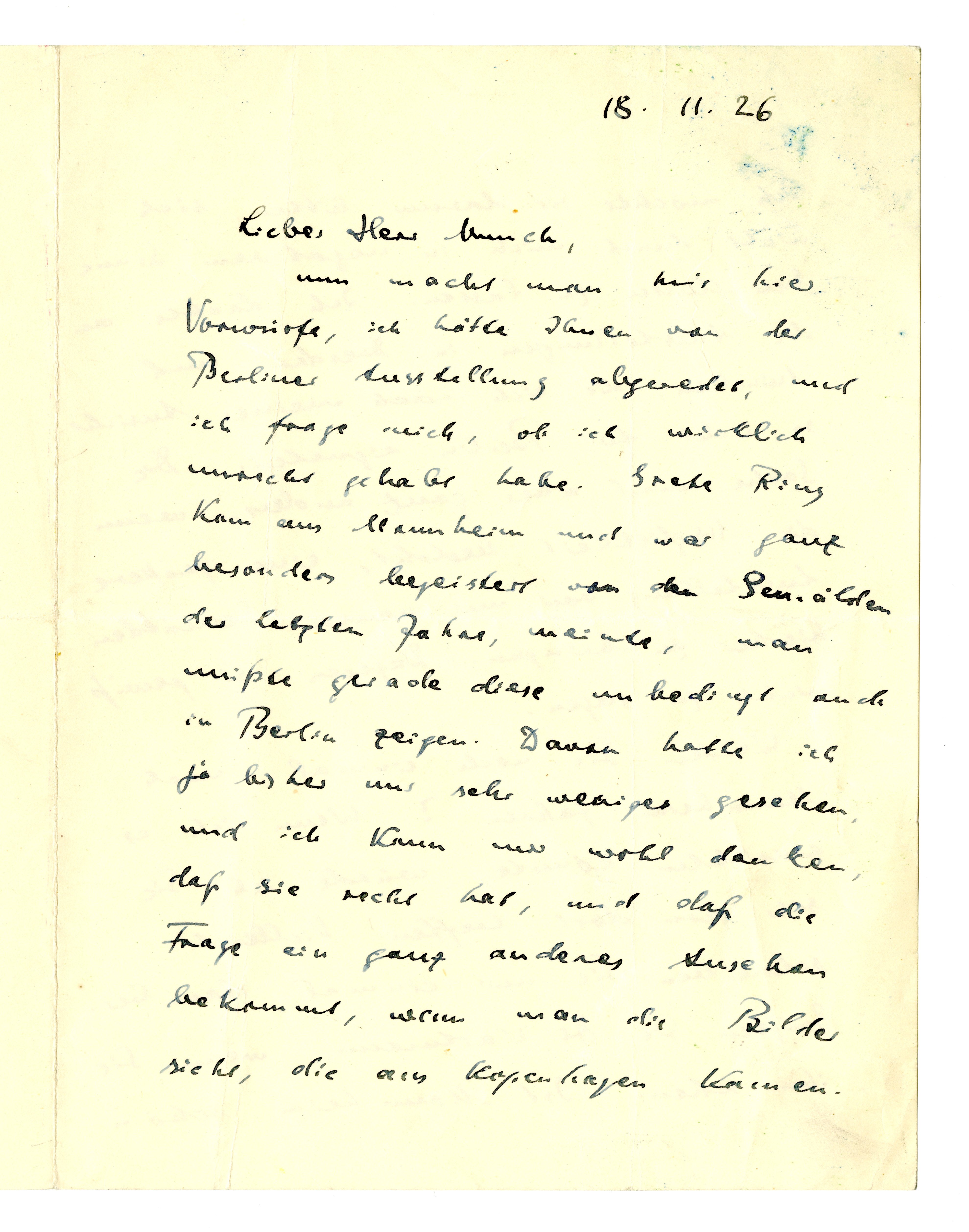 MM K 2357, Munchmuseet. Datert 18.11.1926. Brev fra Curt Glaser.