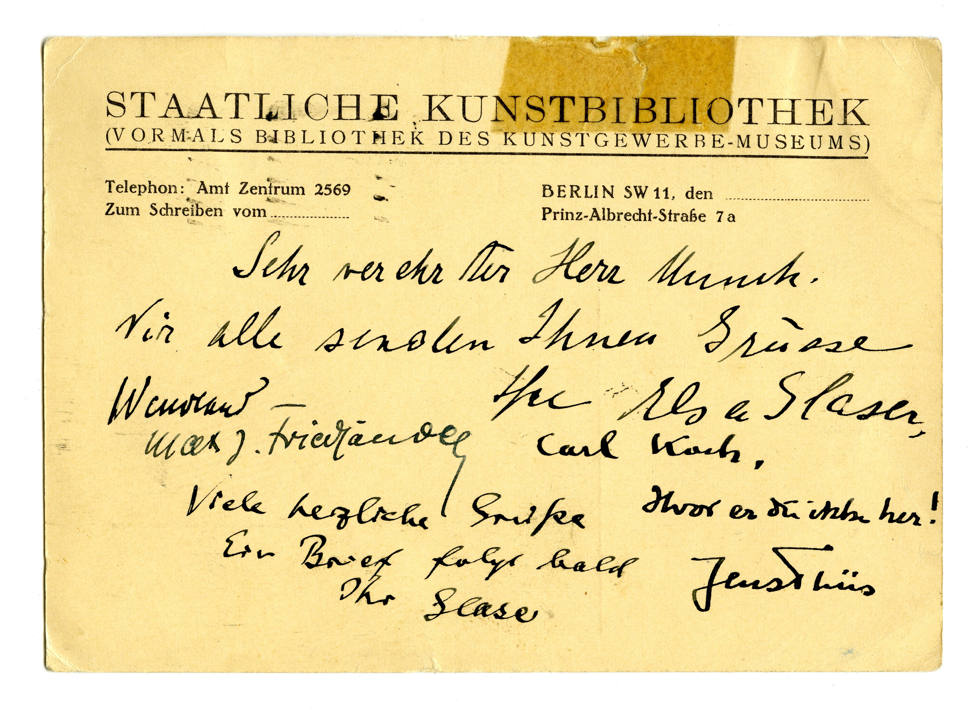 MM K 2395, Munchmuseet. Ikke datert. Brev fra Curt Glaser, Elsa Glaser, Wendland, Max J. Friedländer, Carl Koch.