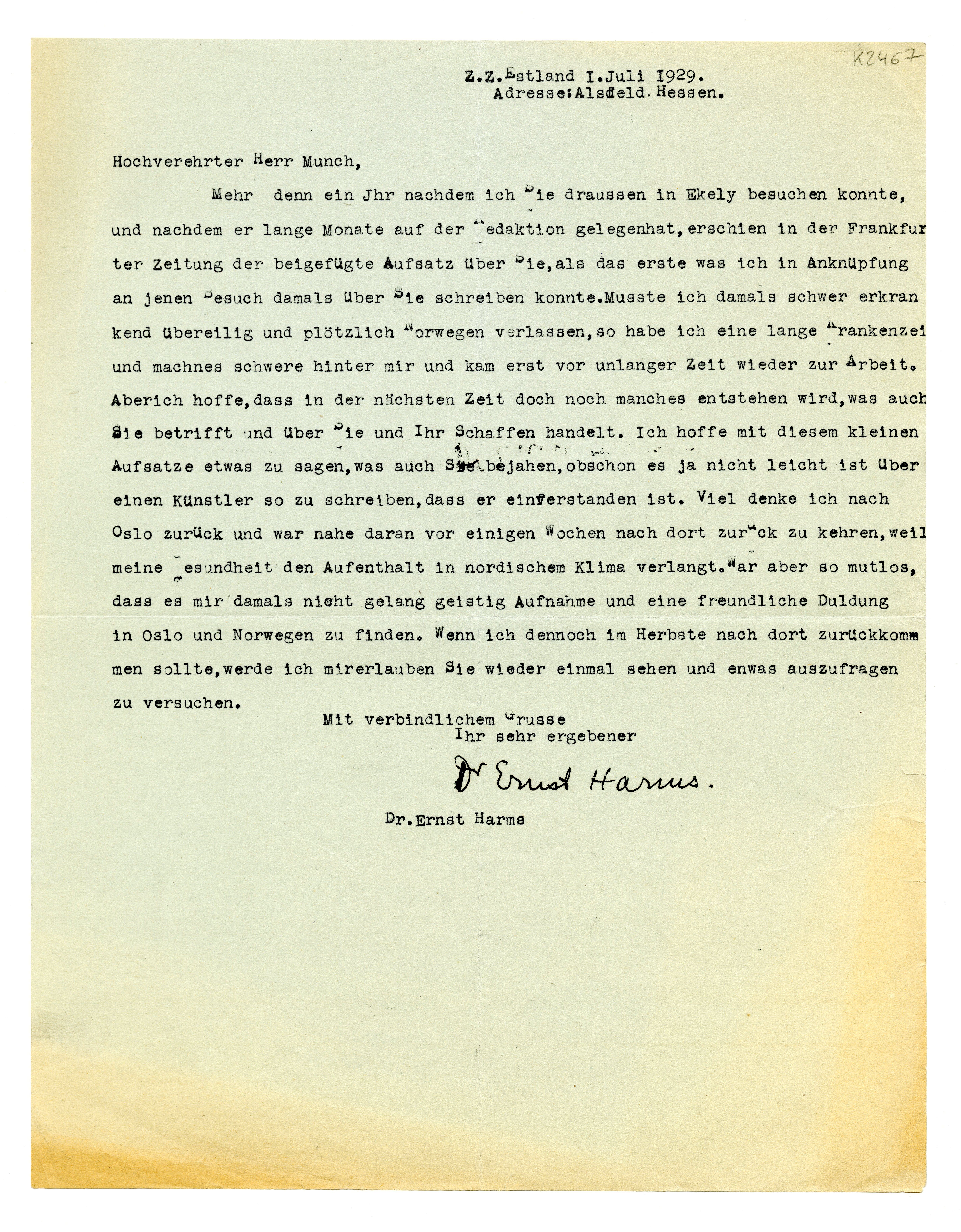 MM K 2467, Munchmuseet. Datert 01.07.1929. Brev fra Ernst Harms.
