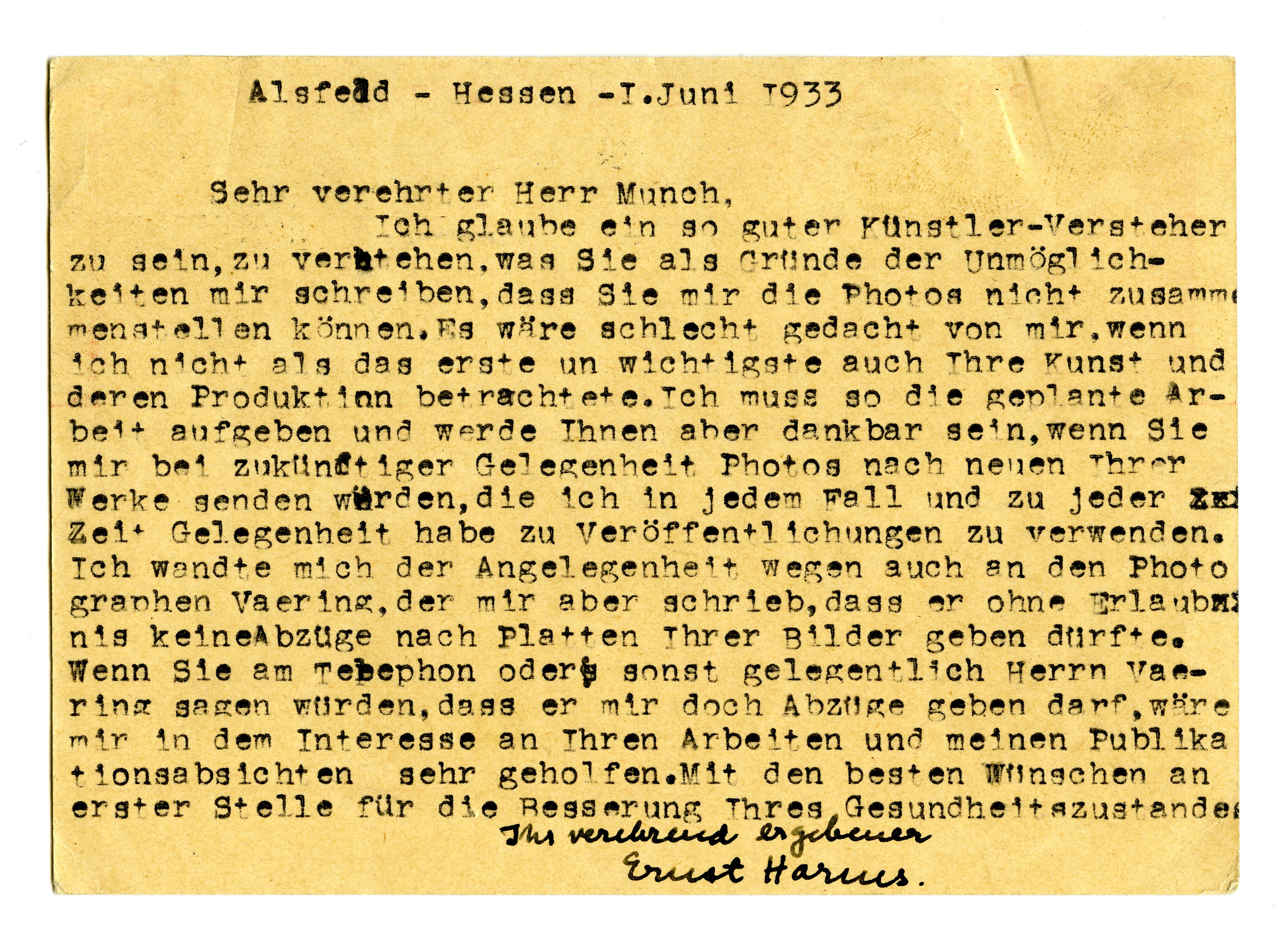 MM K 2472, Munchmuseet. Datert 01.07.1933. Brev fra Ernst Harms.