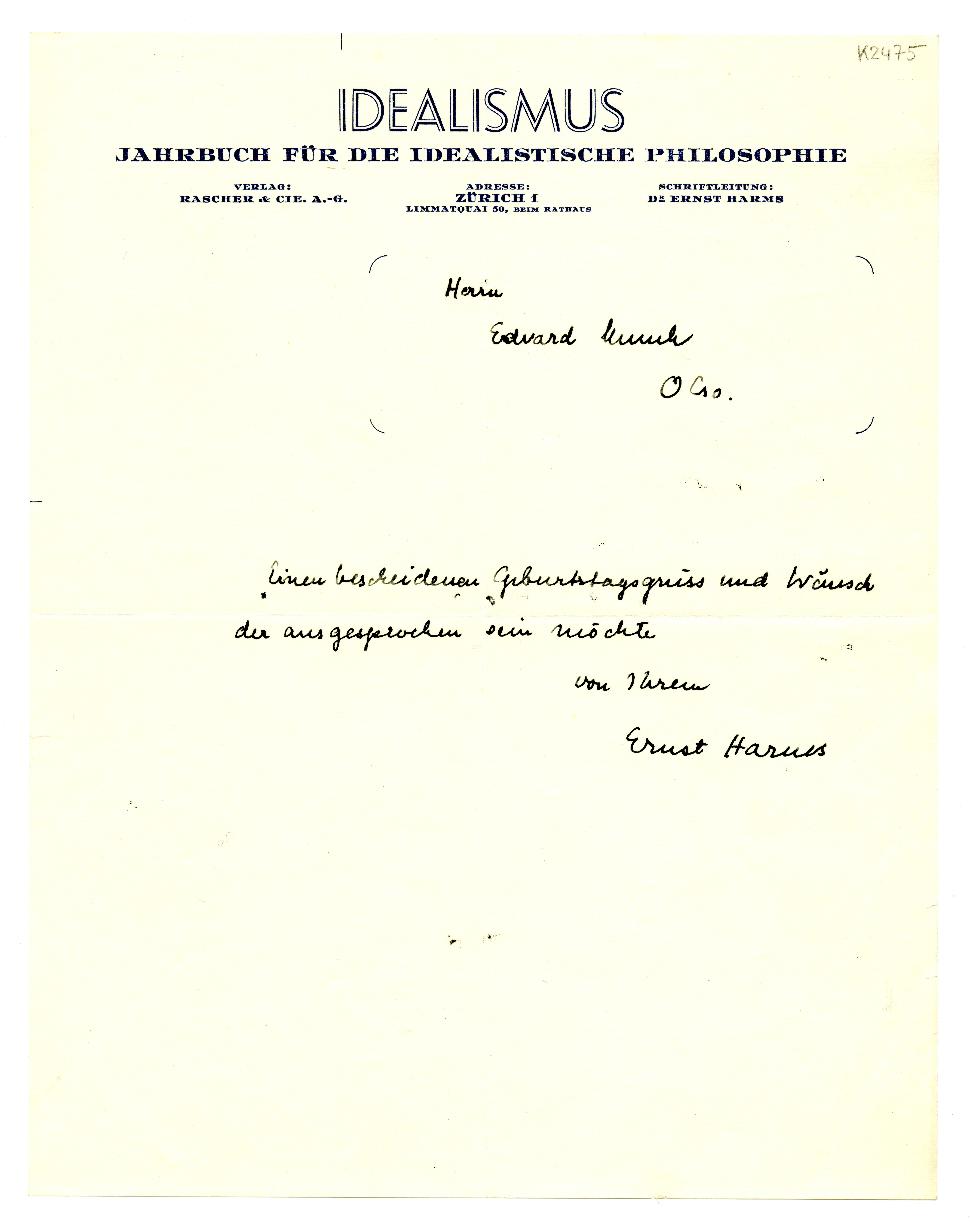 MM K 2475, Munchmuseet. Ikke datert. Brev fra Ernst Harms.