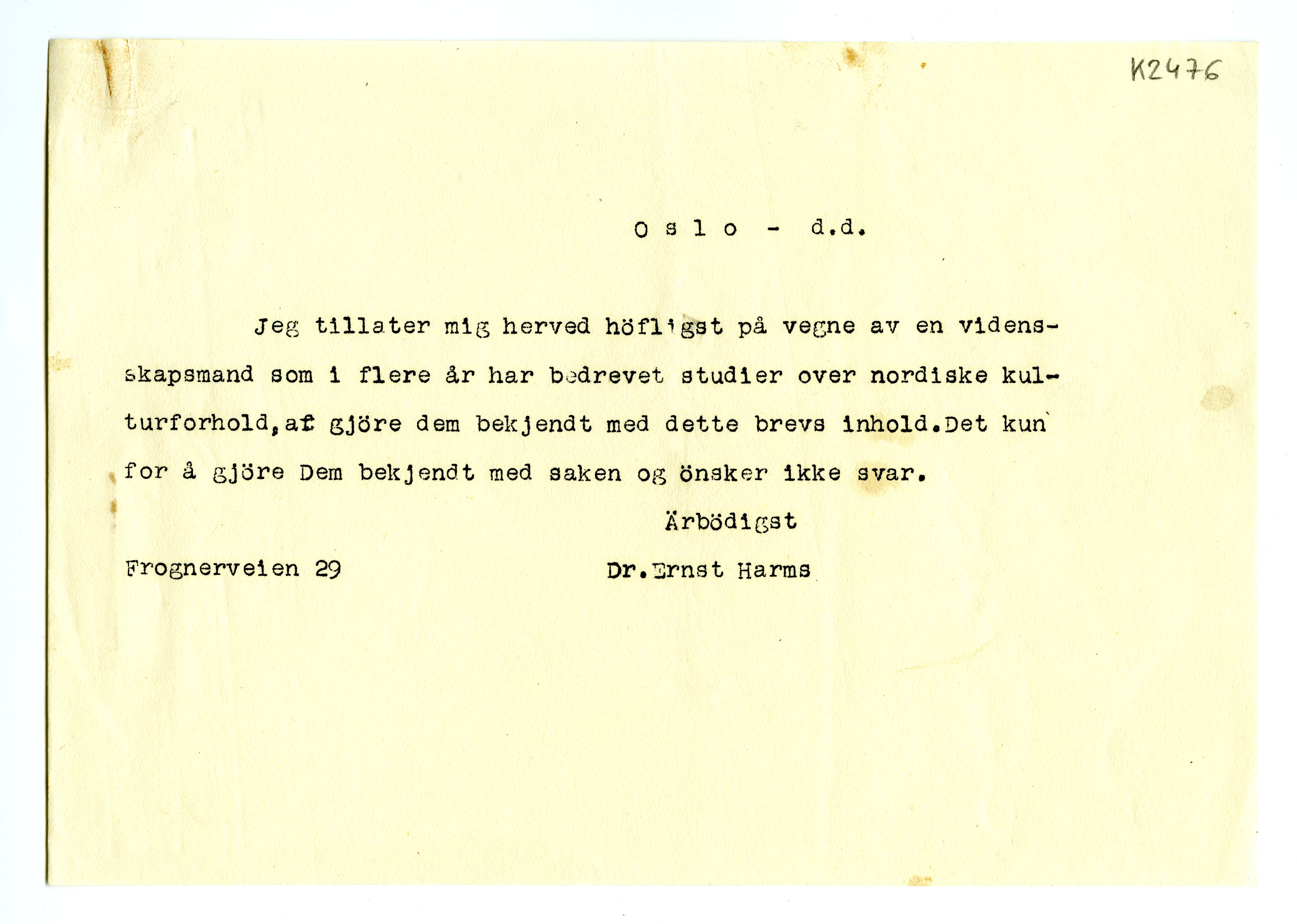 MM K 2476, Munchmuseet. Ikke datert. Brev fra Ernst Harms.