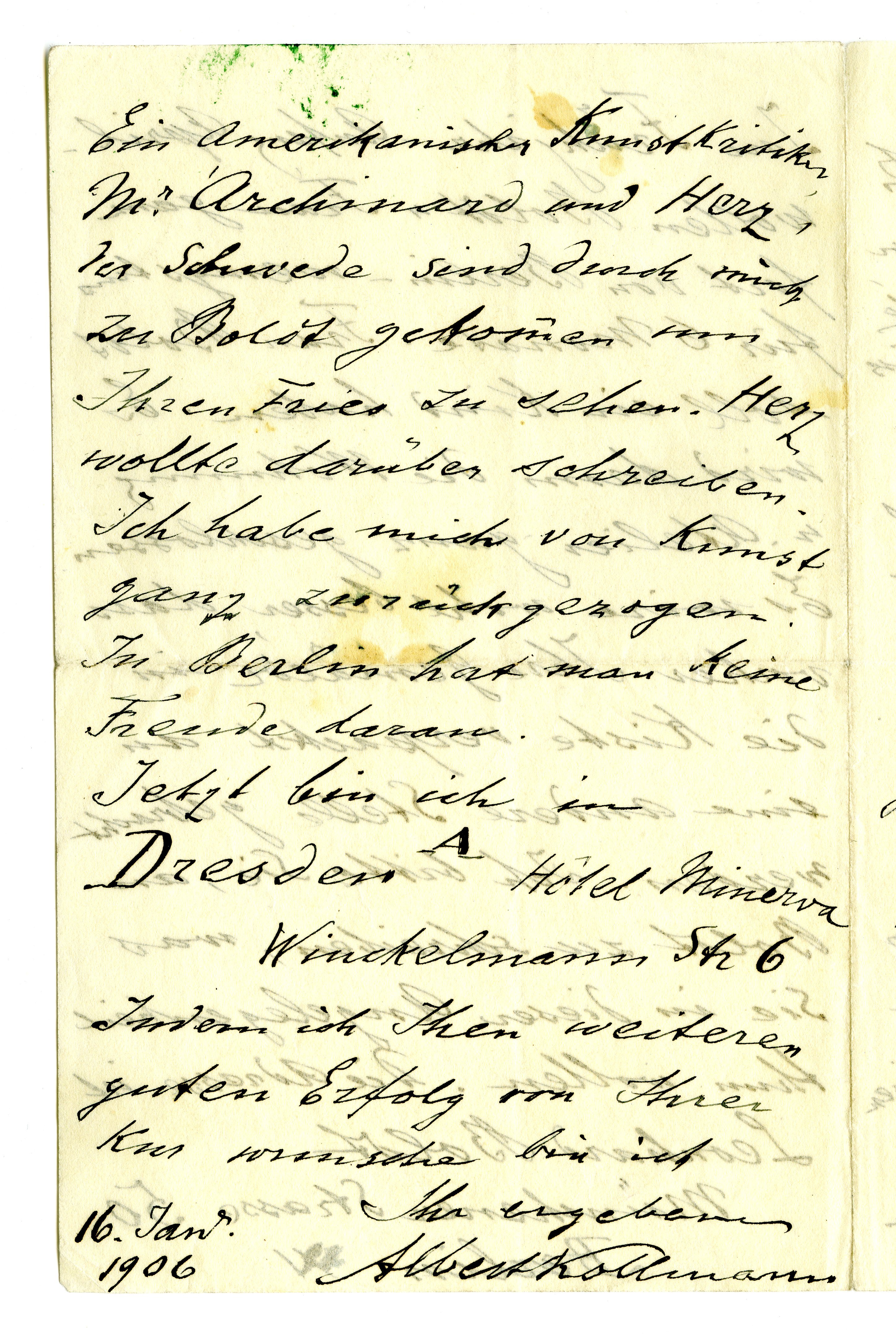 MM K 2654, Munchmuseet. Datert 16.01.1906. Brev fra Albert Kollmann.