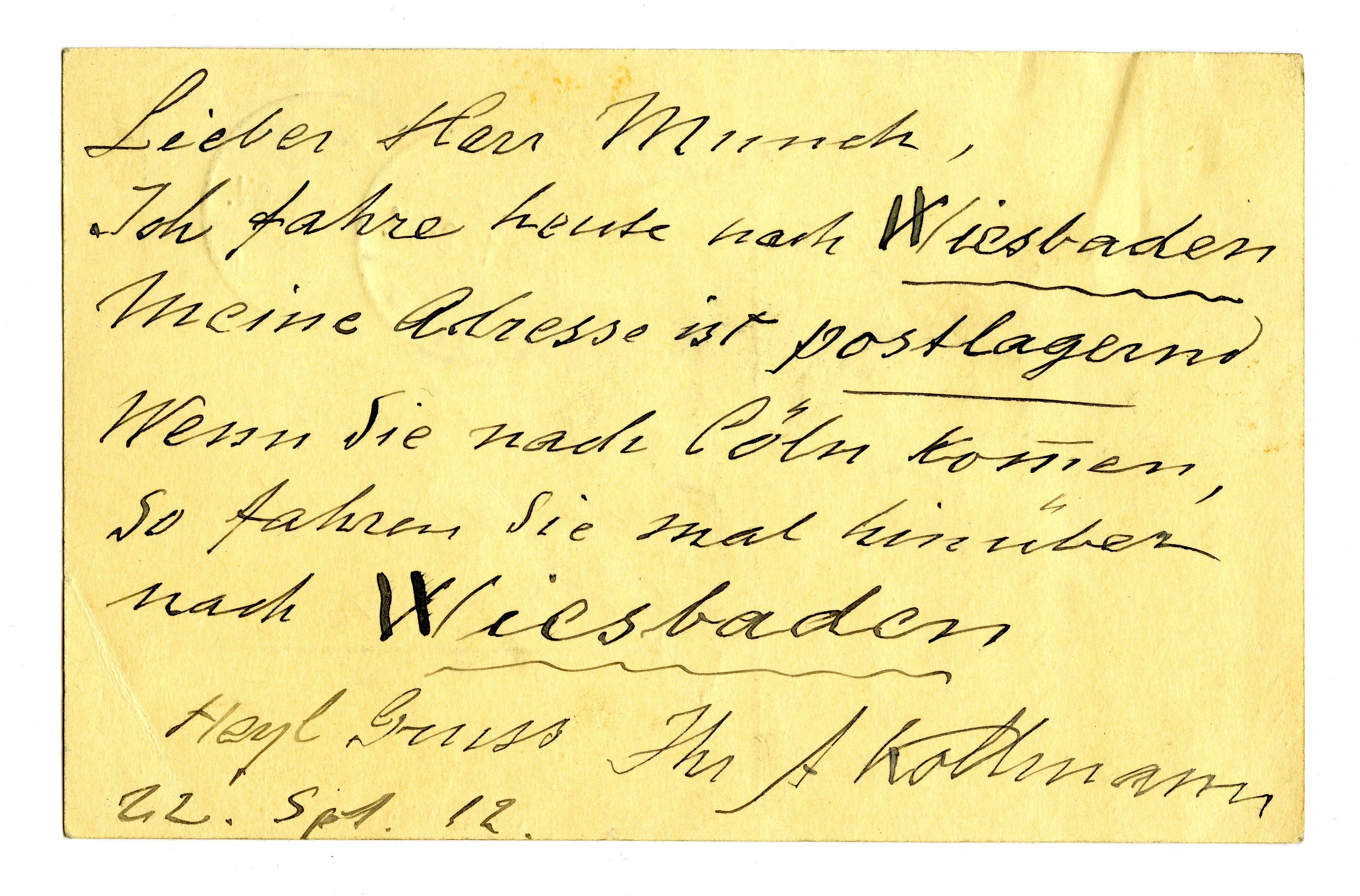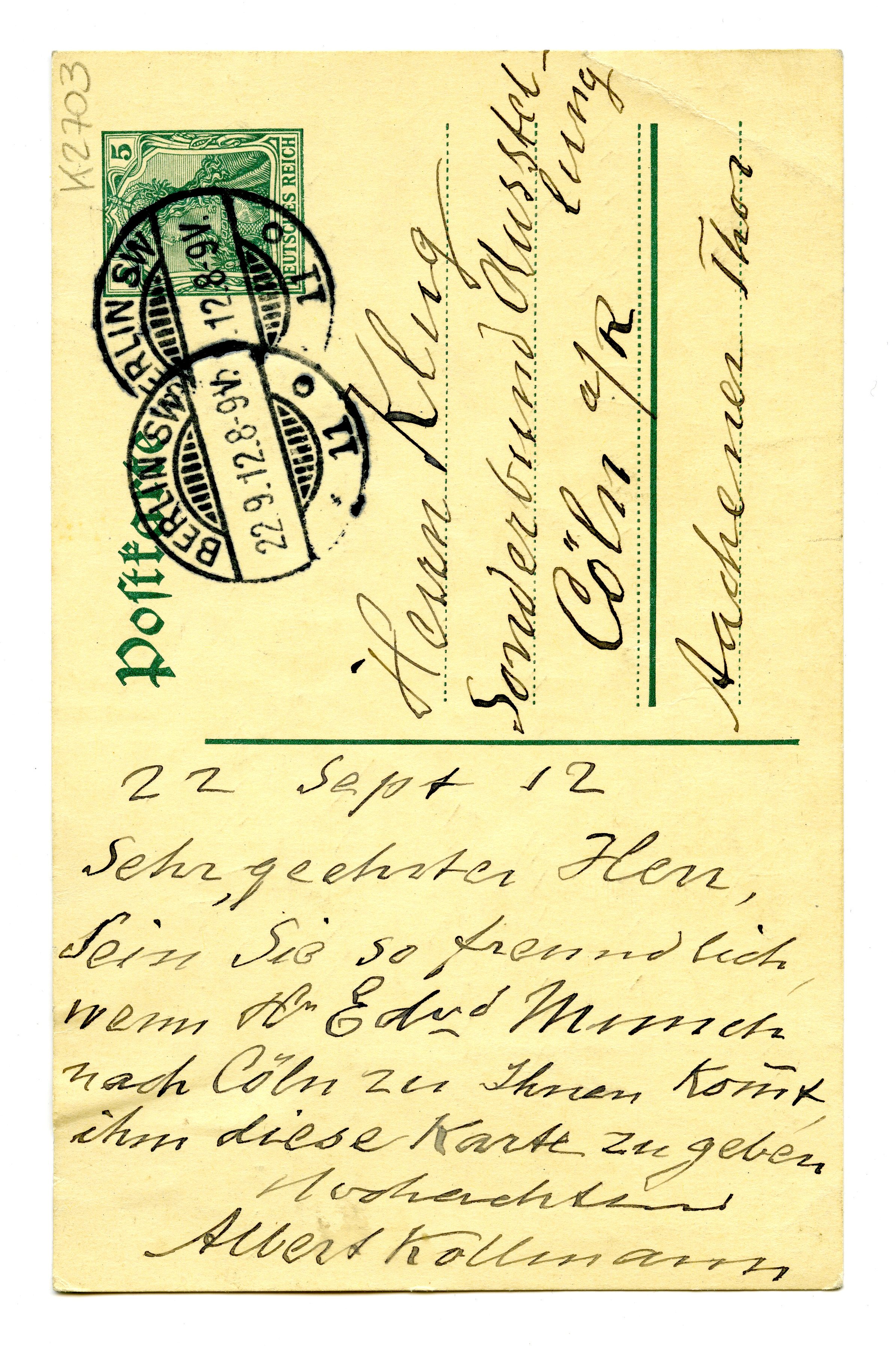 MM K 2703, Munchmuseet. Datert 22.09.1912. Brev fra Albert Kollmann.