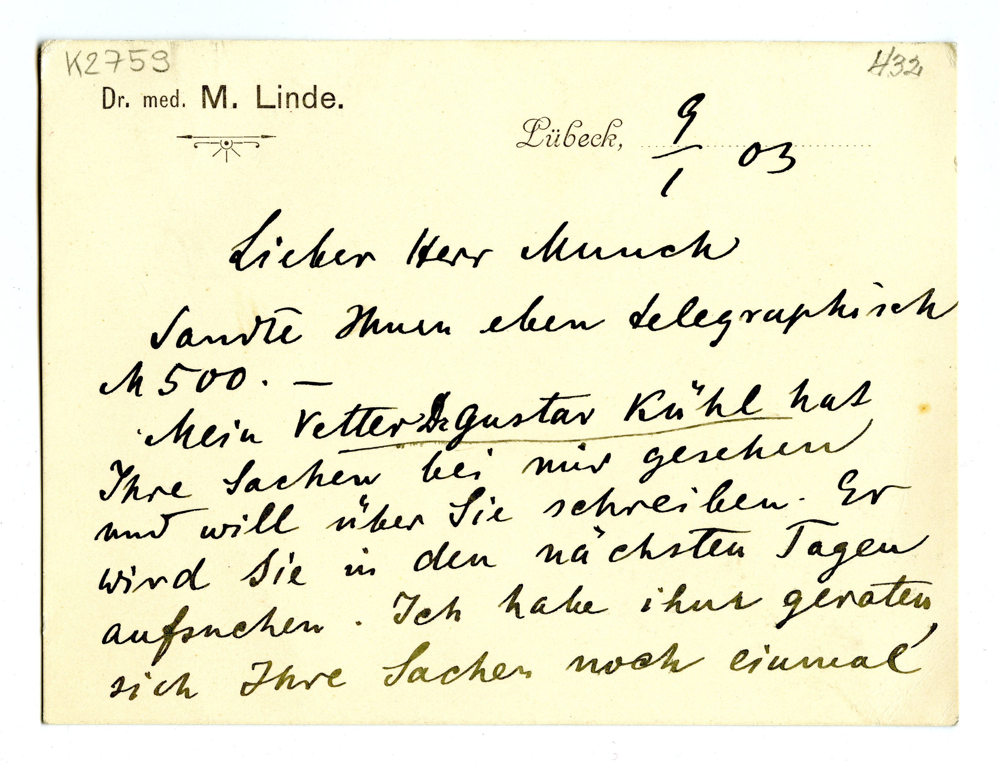 MM K 2759, Munchmuseet. Datert 09.01.1903. Brev fra Max Linde.