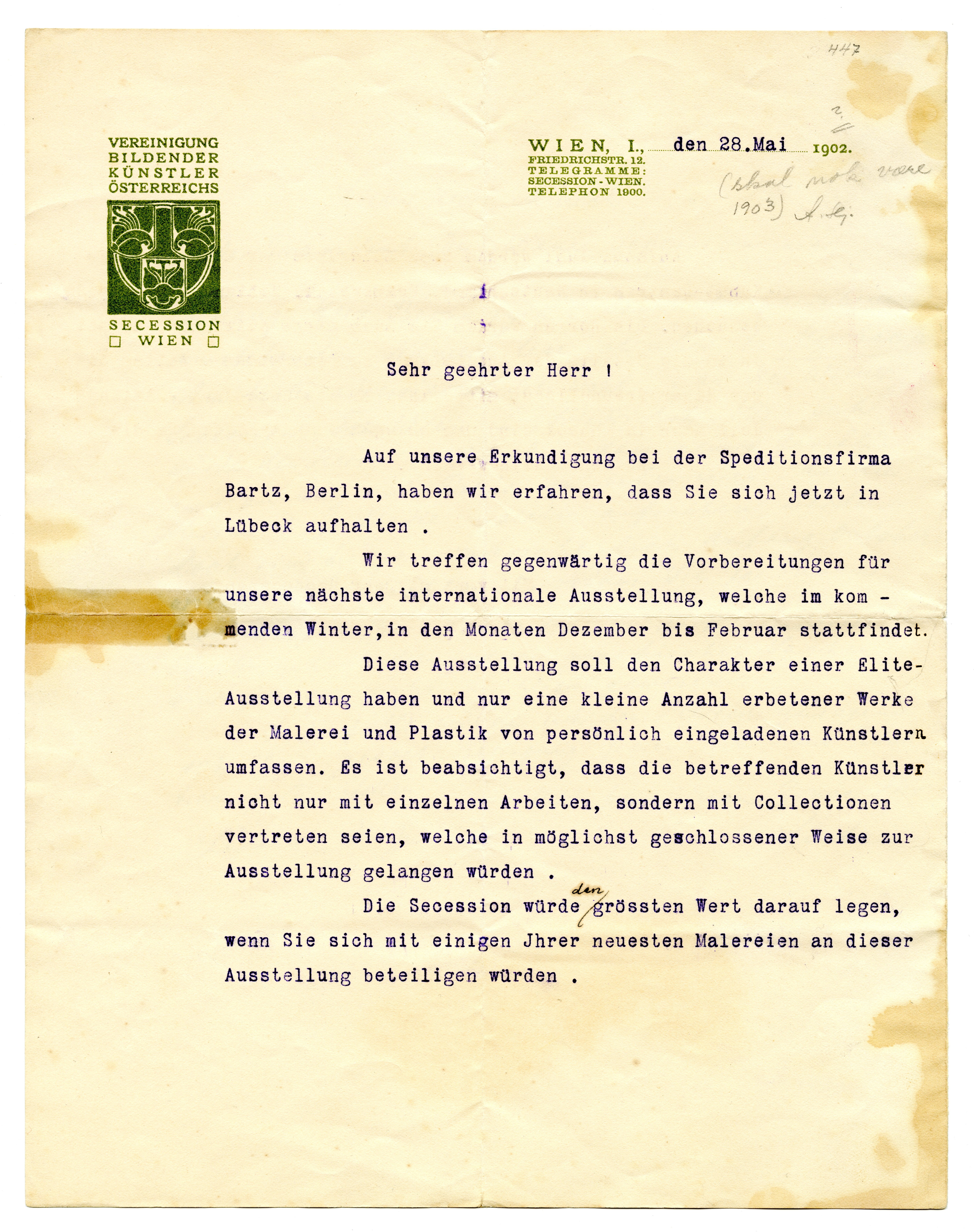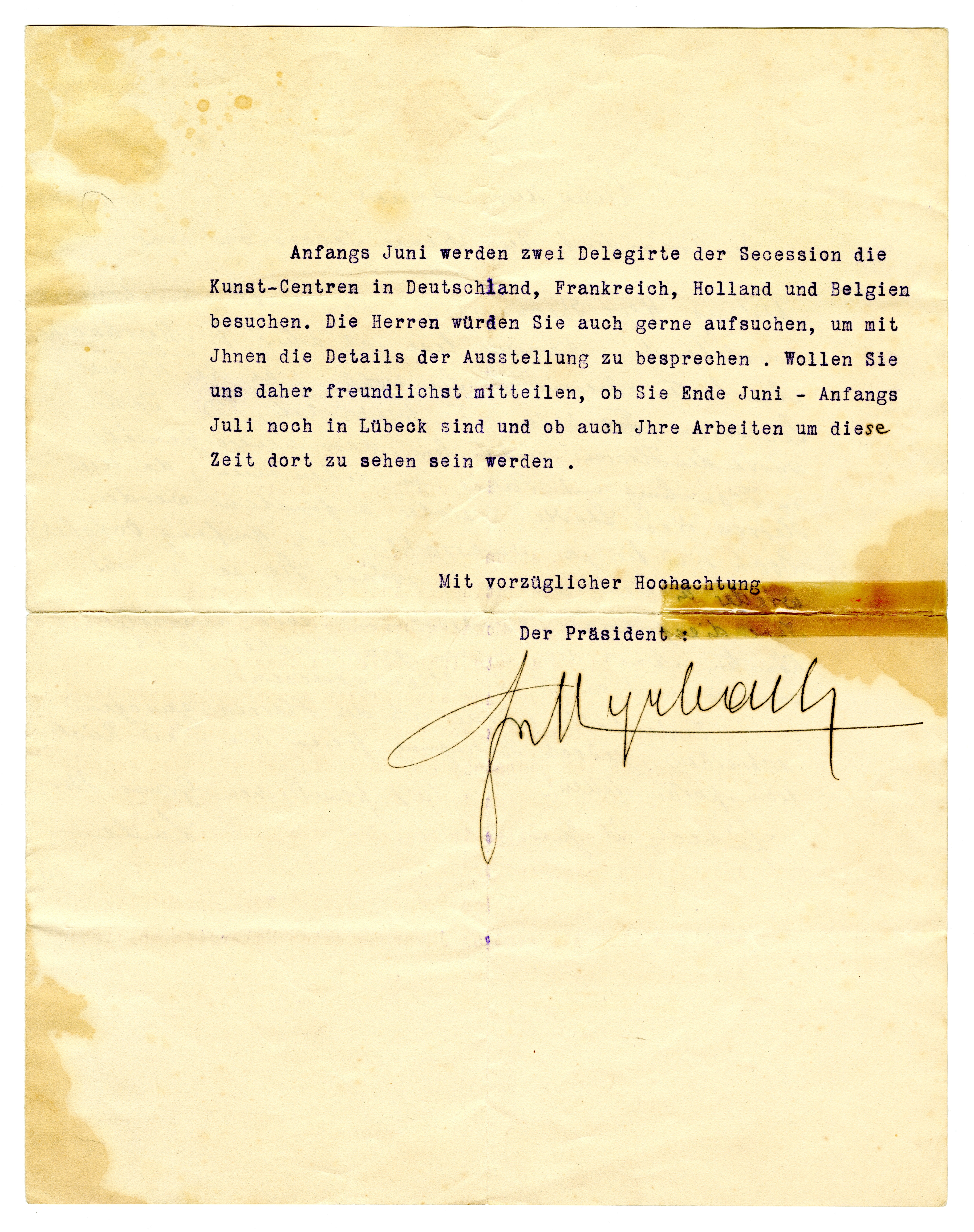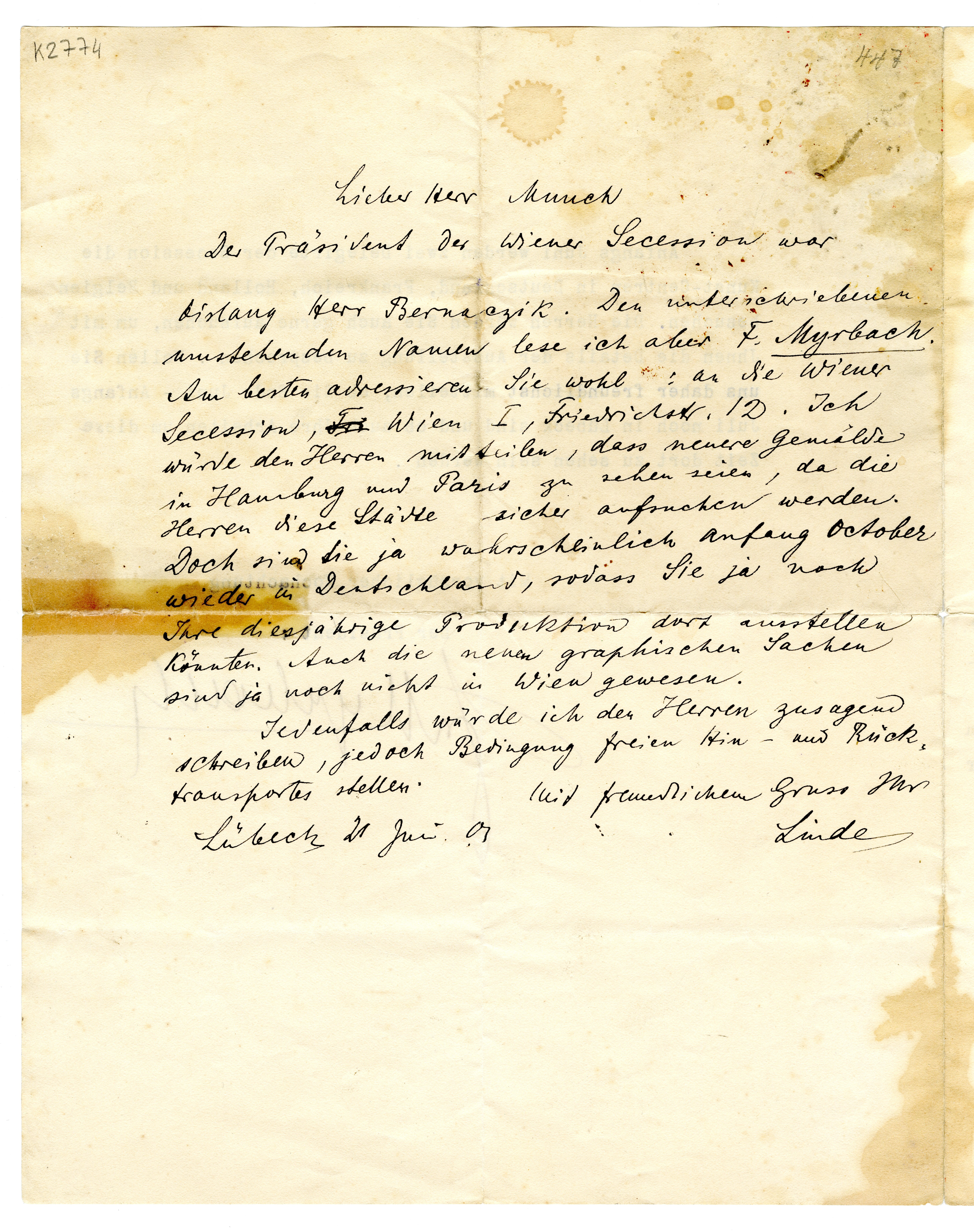 Filologisk kommentar: Brev fra Felician Myrbach (president i Wiener Secession) til Linde vedlagt.