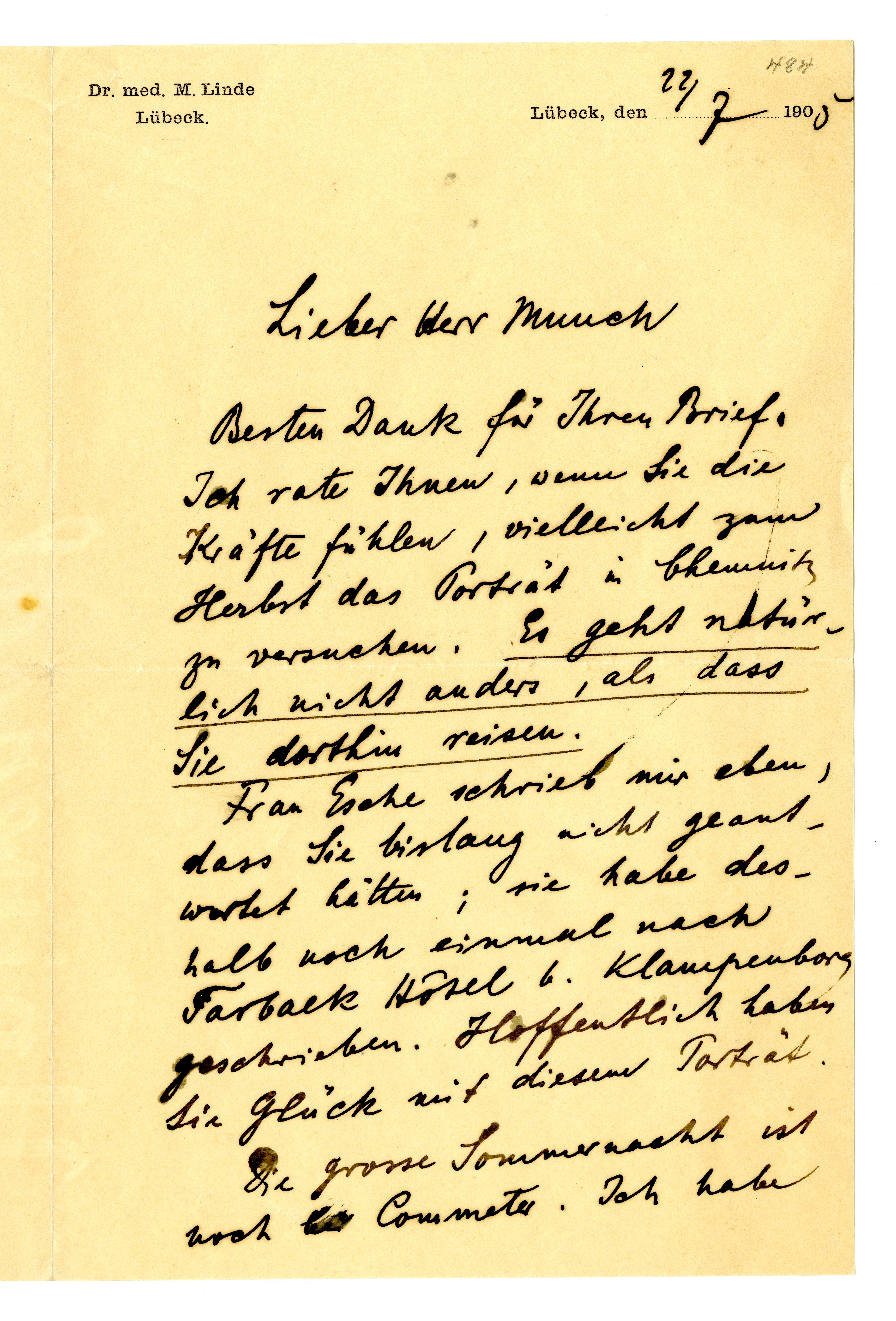 MM K 2811, Munchmuseet. Datert 22.07.1905. Brev fra Max Linde.
