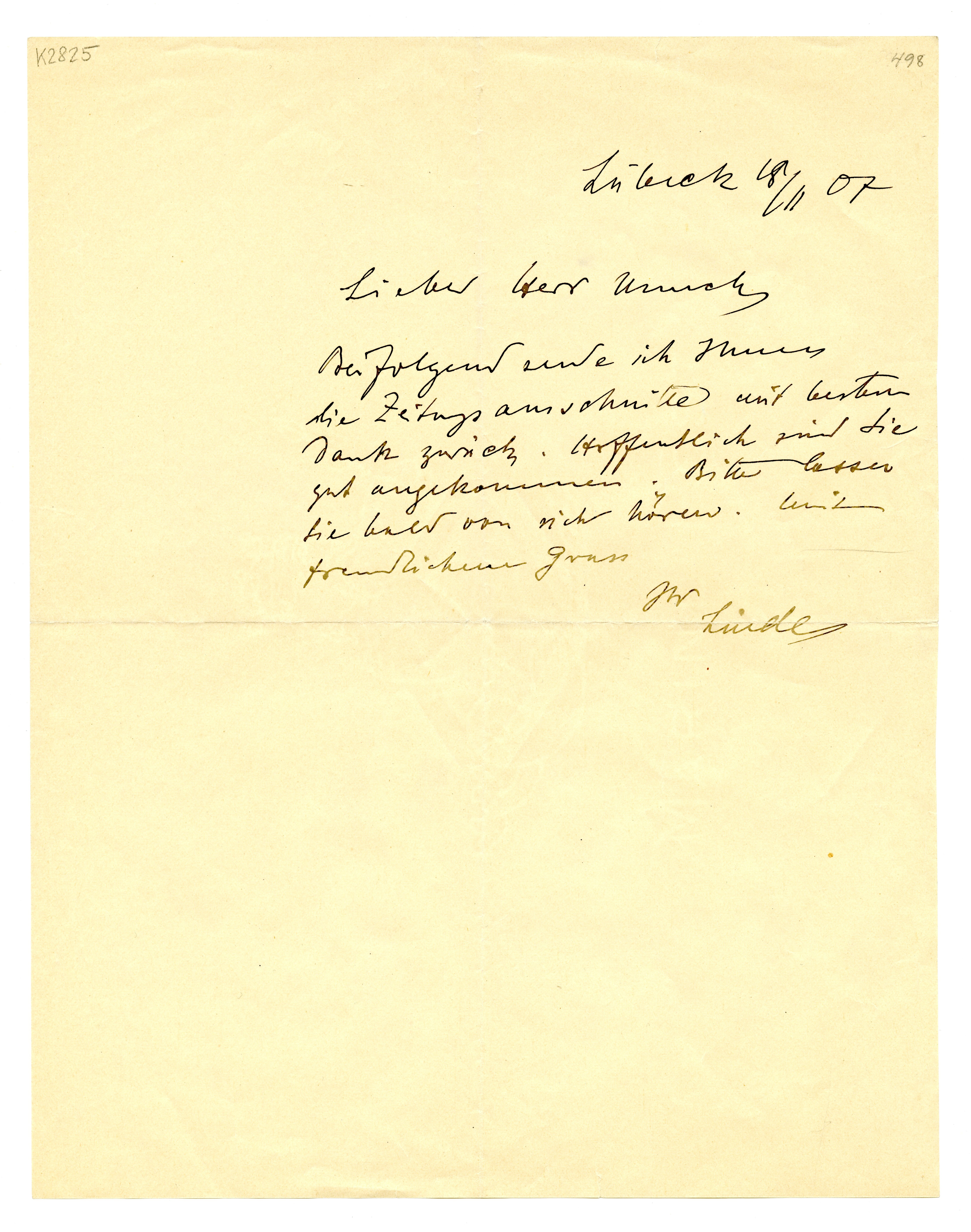 MM K 2825, Munchmuseet. Datert 18.11.1907. Brev fra Max Linde.
