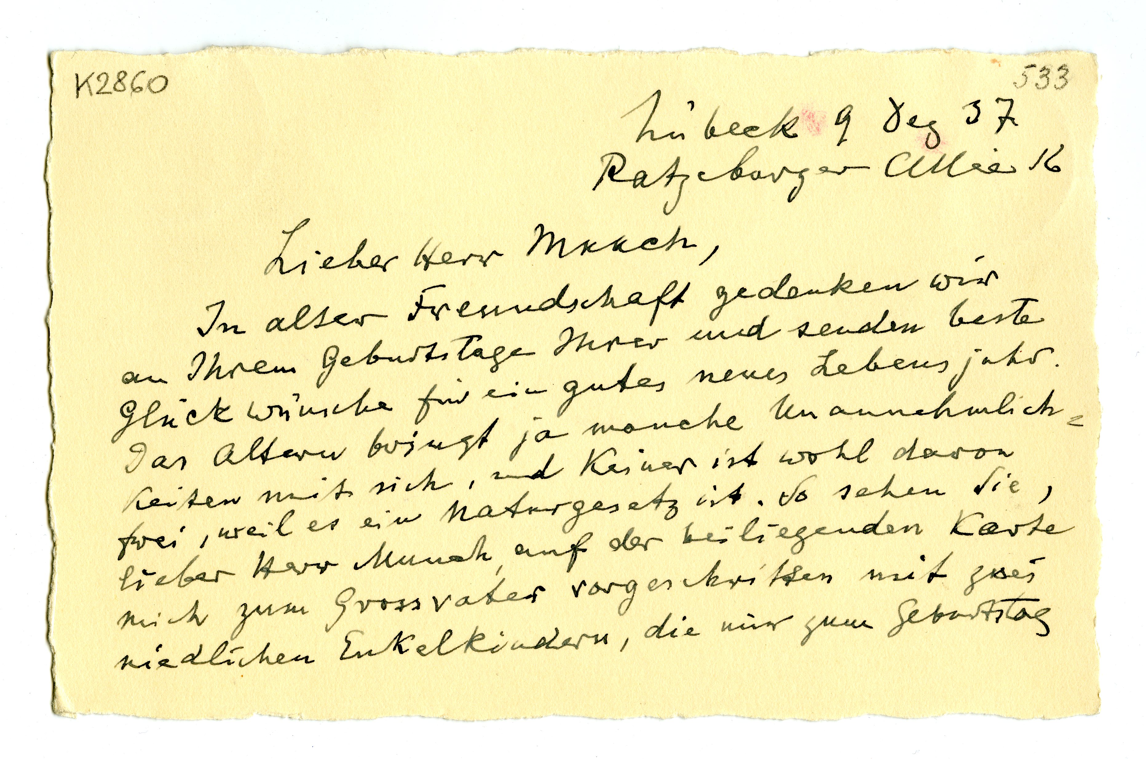 MM K 2860, Munchmuseet. Datert 09.12.1937. Brev fra Max Linde.