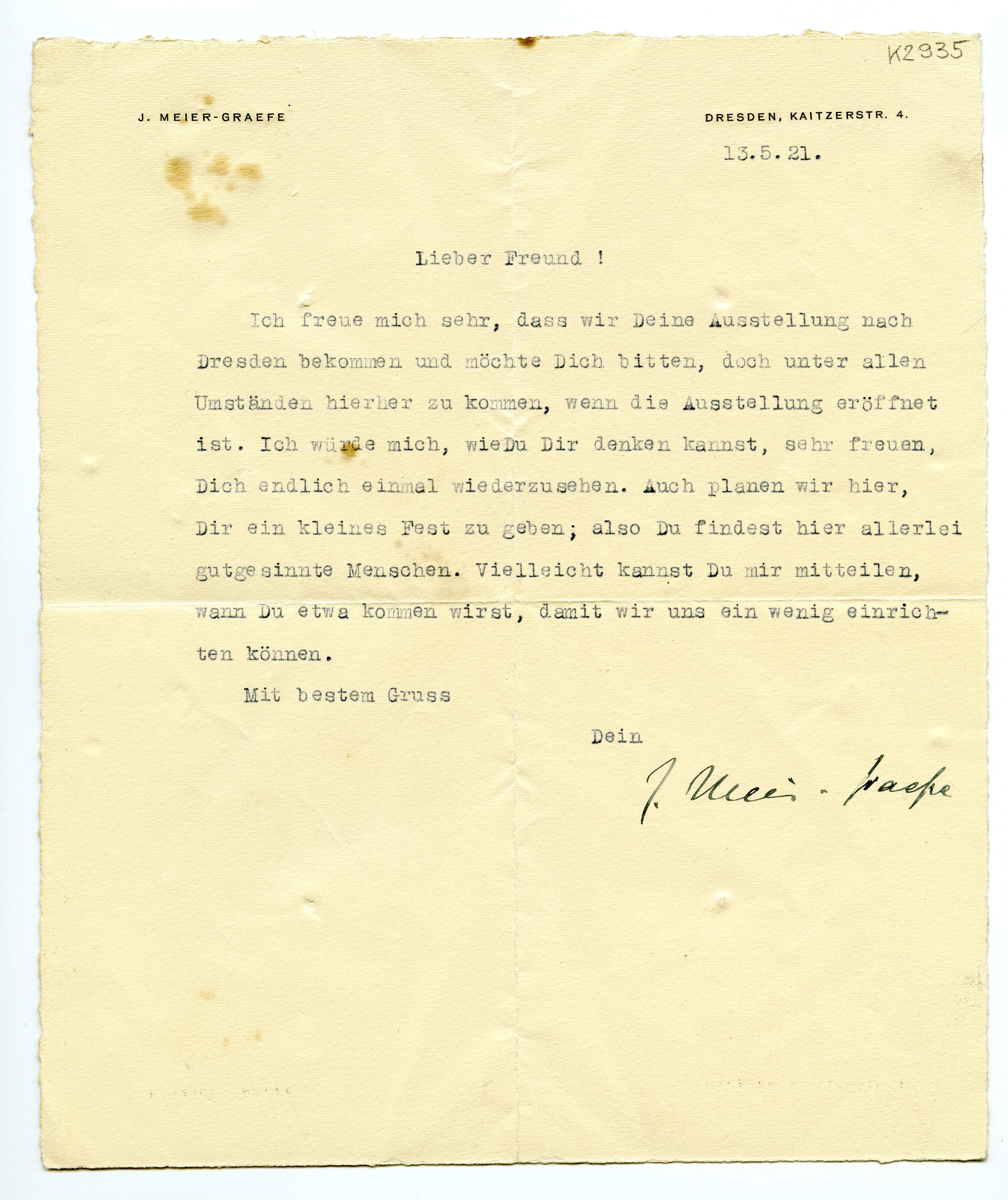 MM K 2935, Munchmuseet. Datert 13.05.1921. Brev fra Julius Meier-Graefe.