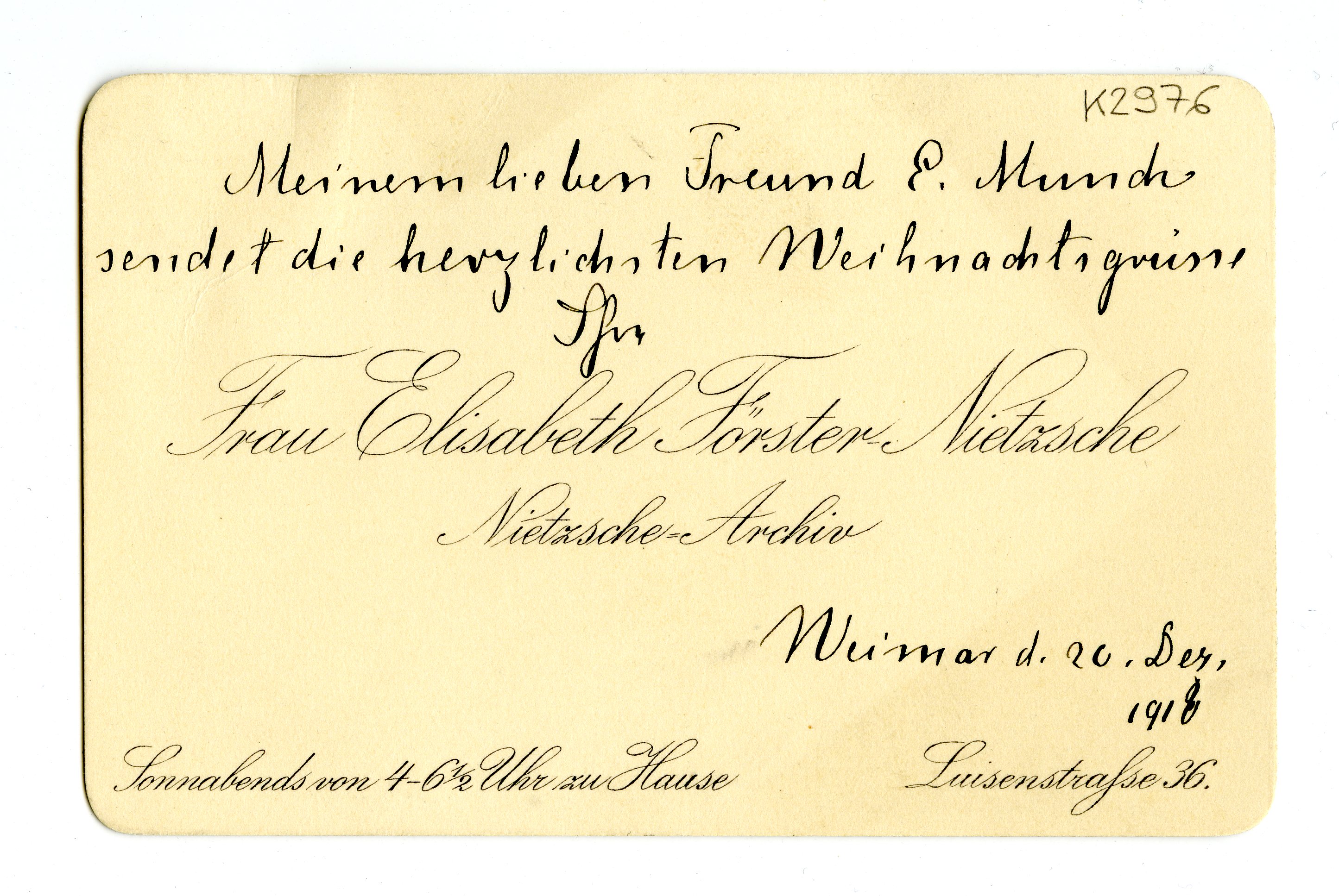 MM K 2976, Munchmuseet. Datert 20.12.1918. Brev fra Elisabeth Förster-Nietzsche, Nietzsche-Archiv.