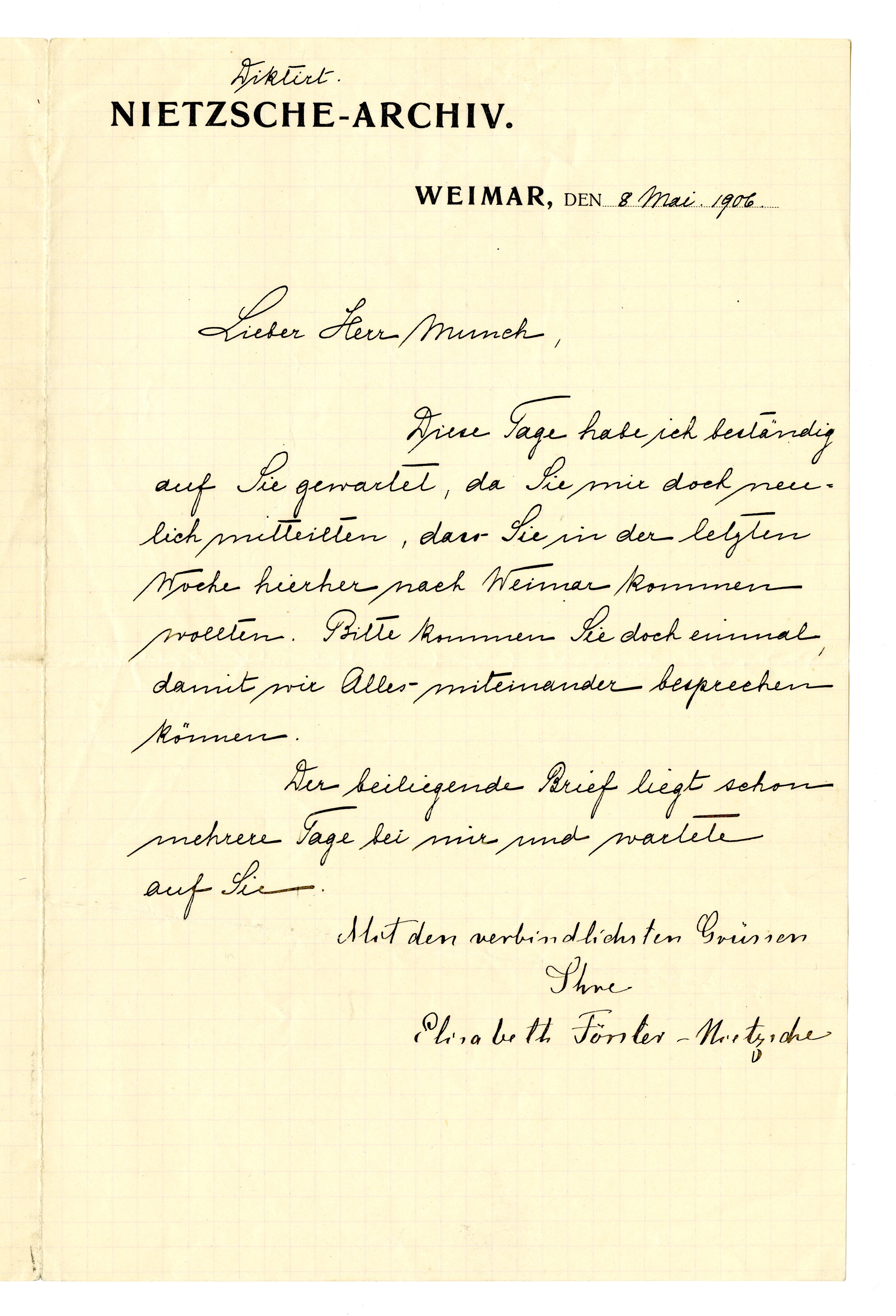 MM K 2983, Munchmuseet. Datert 08.05.1906. Brev fra Elisabeth Förster-Nietzsche, Nietzsche-Archiv.