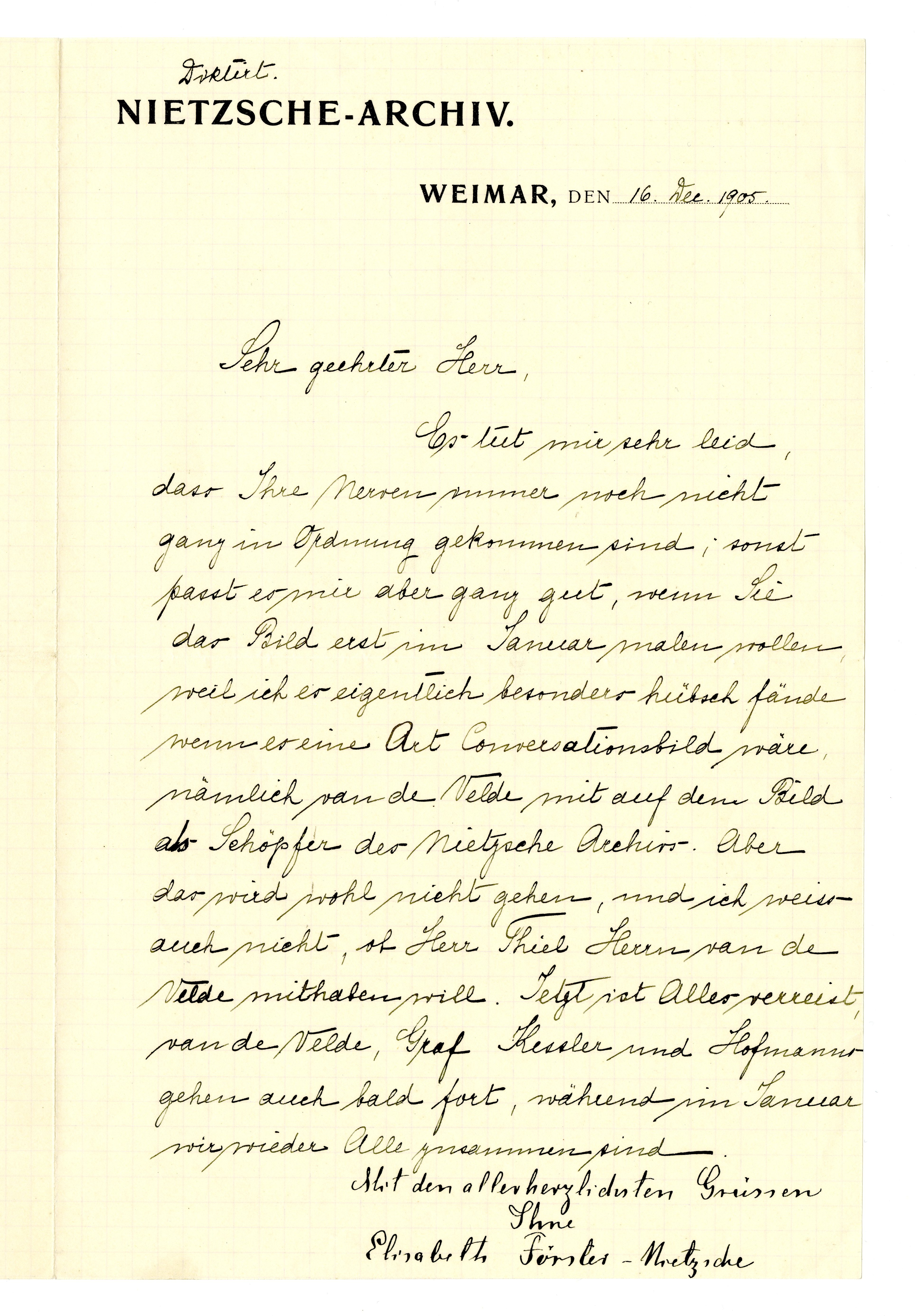 MM K 2989, Munchmuseet. Datert 16.12.1905. Brev fra Elisabeth Förster-Nietzsche, Nietzsche-Archiv.