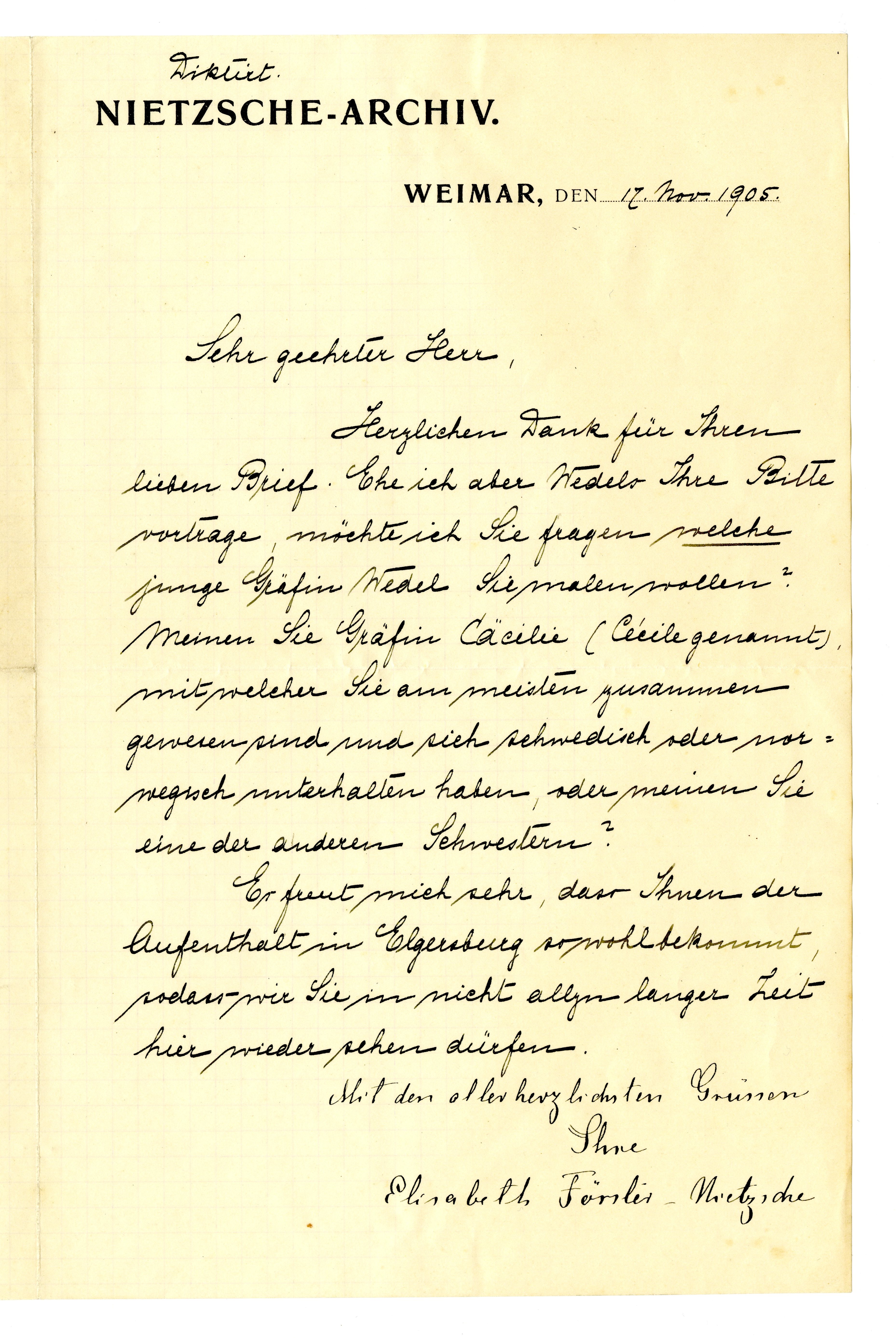 MM K 2994, Munchmuseet. Datert 17.11.1905. Brev fra Elisabeth Förster-Nietzsche, Nietzsche-Archiv.
