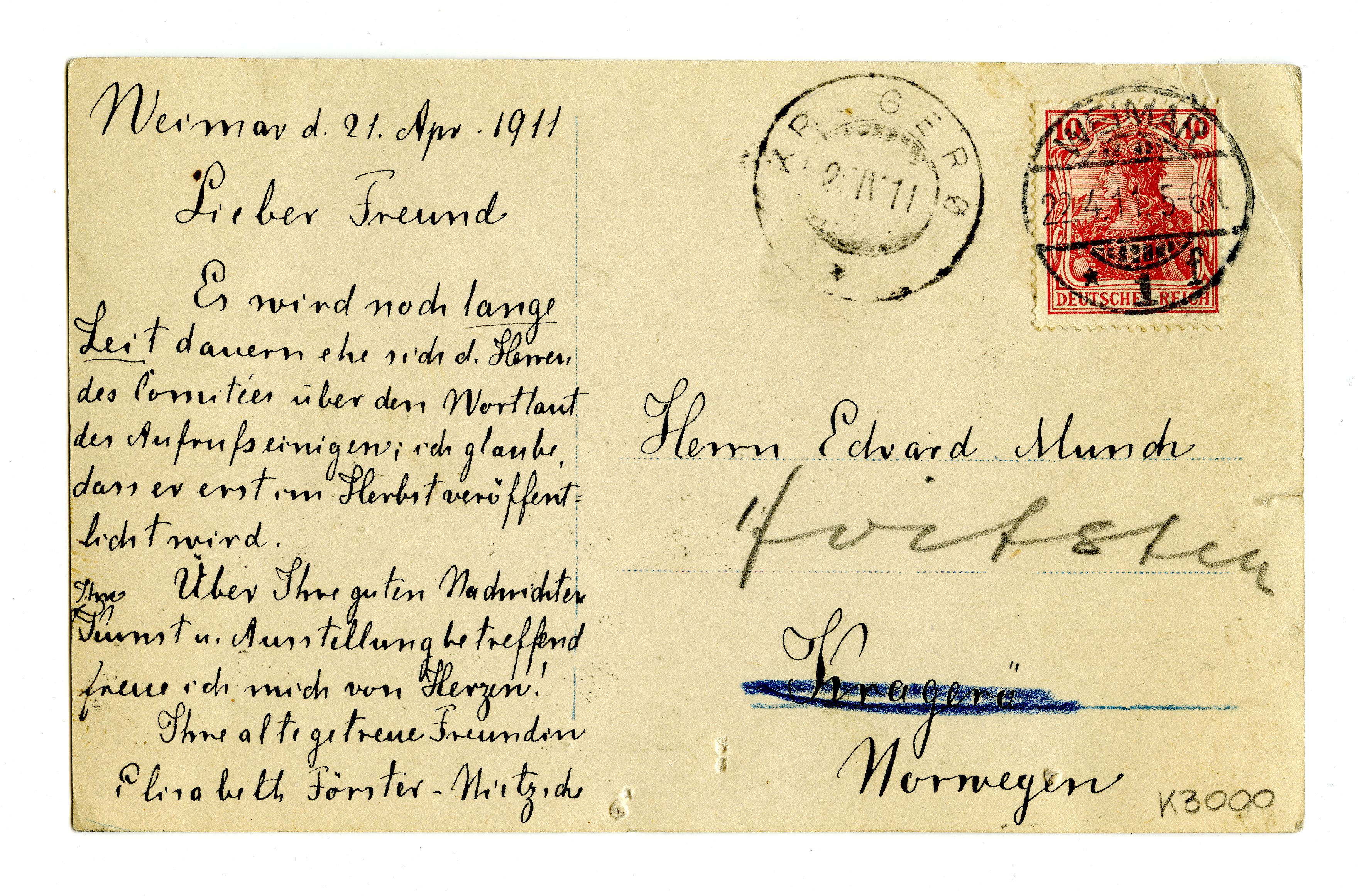 MM K 3000, Munchmuseet. Datert 21.04.1911. Brev fra Elisabeth Förster-Nietzsche.