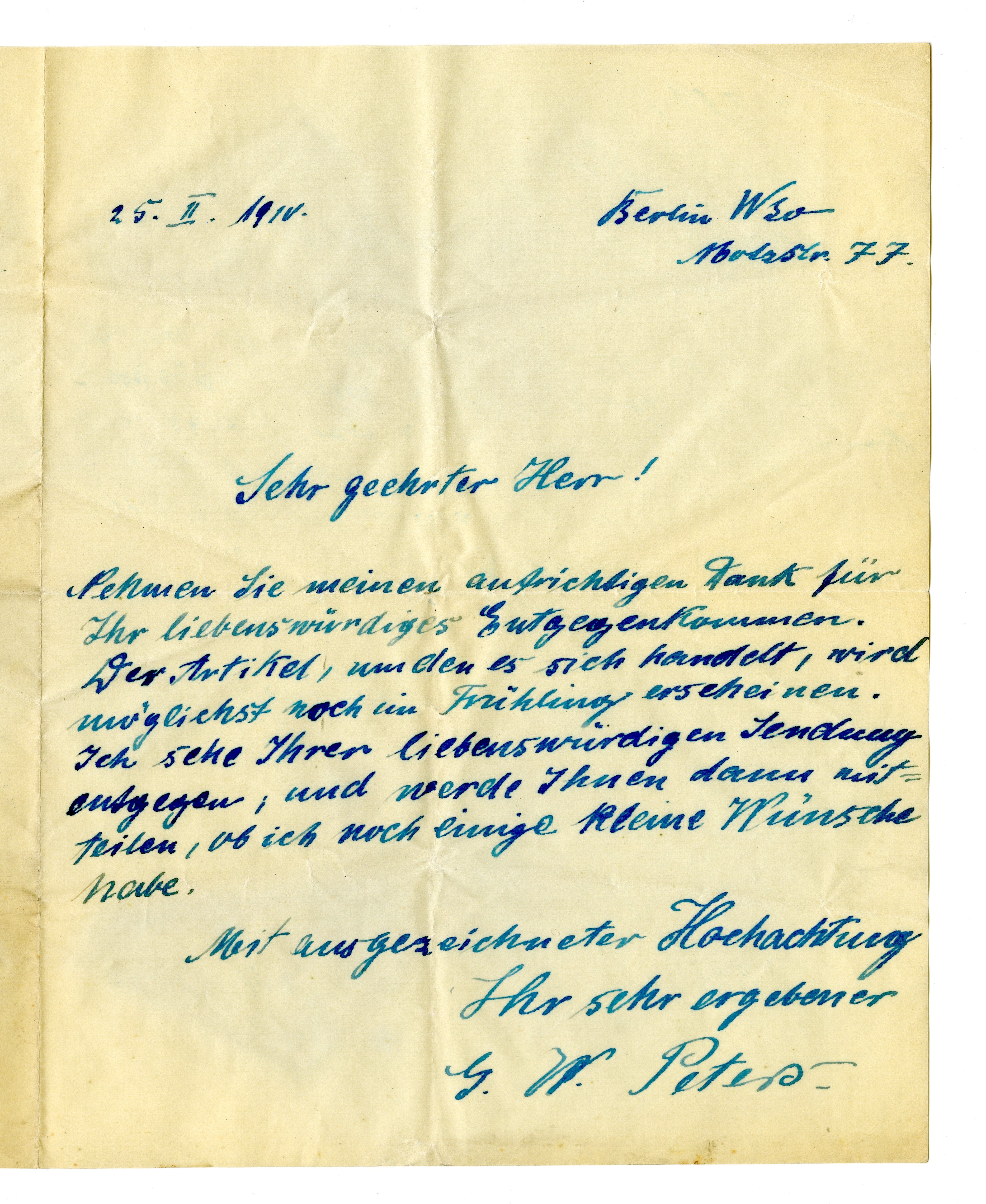 MM K 3010, Munchmuseet. Datert 25.02.1910. Brev fra Gustav Werner Peters.