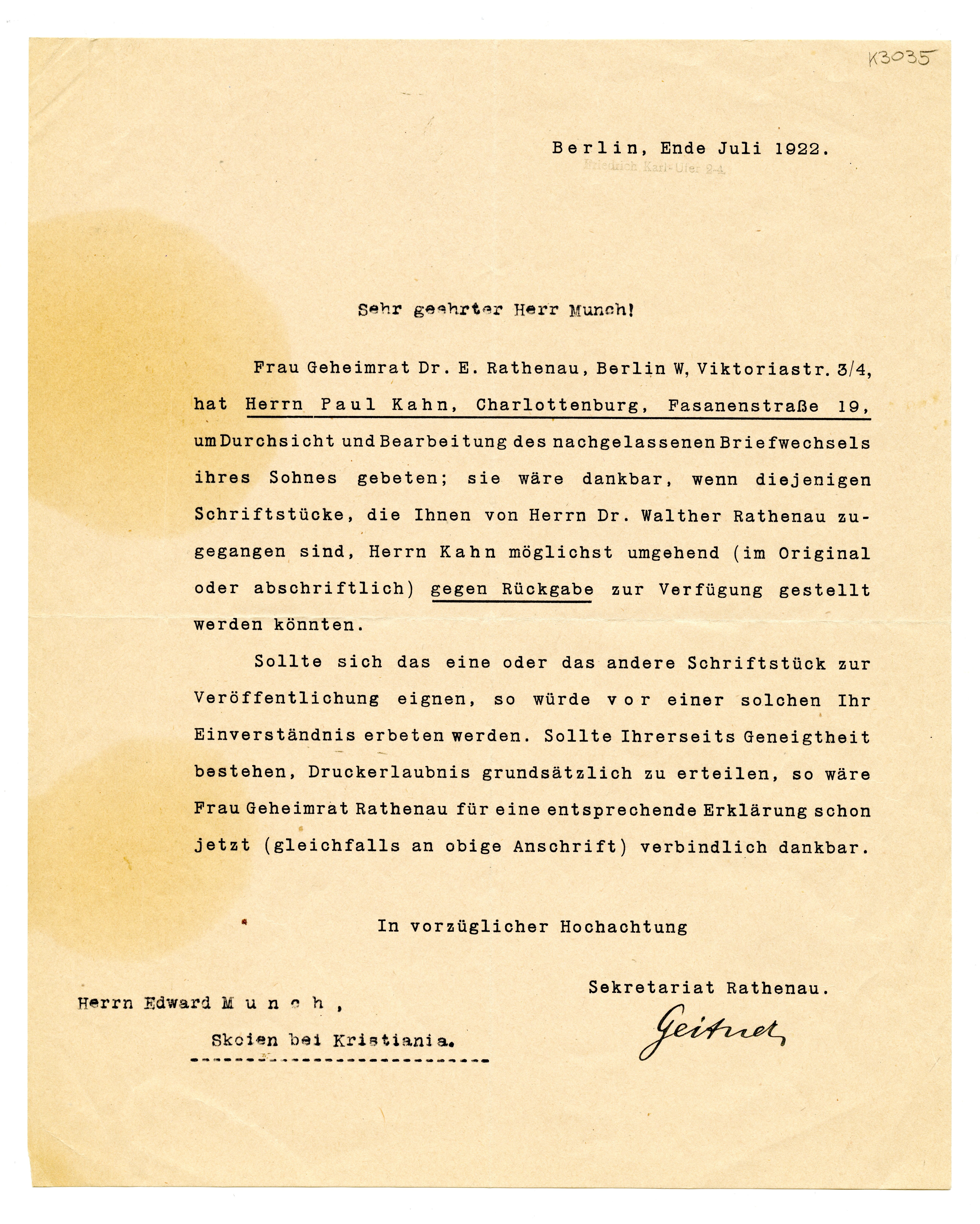 MM K 3035, Munchmuseet. Datert [??].07.1922. Brev fra Walther Rathenau, Geither.